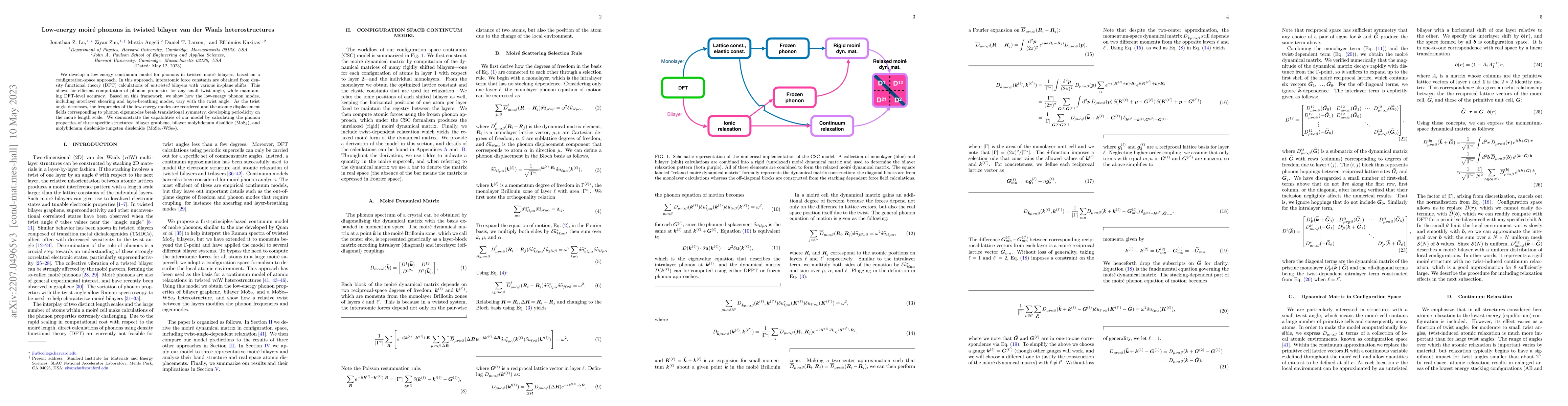 This research develops a low-energy continuum model for phonons in twisted moir\'e bilayers, derived from density functional theory, to efficiently compute phonon properties at small twist angles. It demonstrates how low-energy phonon modes vary with twist angle, showing reordering and symmetry-breaking effects, and applies the model to bilayer graphene, MoS$_2$, and MoSe$_2$-WSe$_2$.