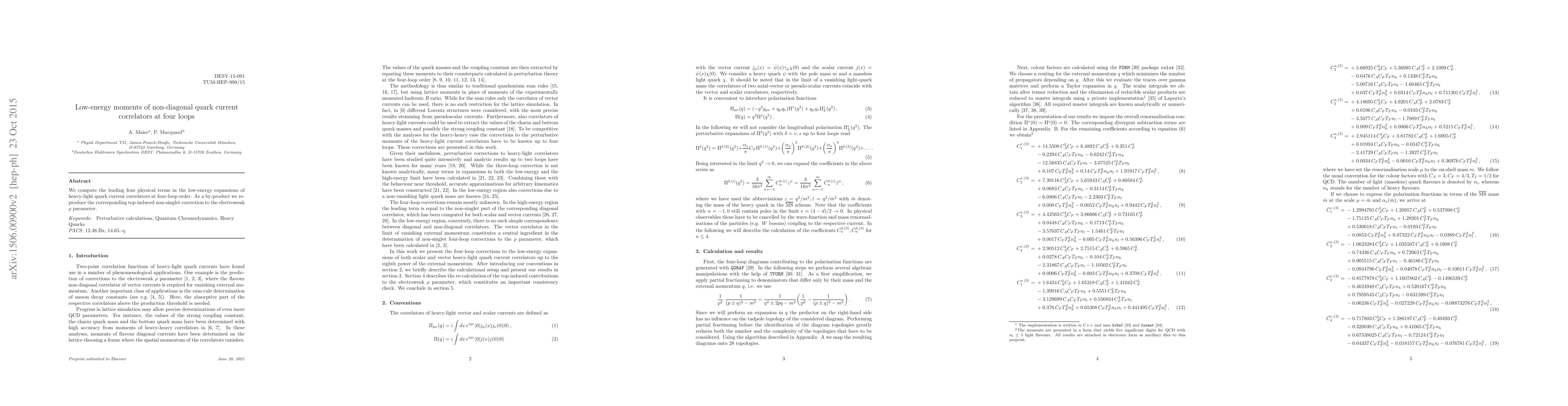We compute the leading four physical terms in the low-energy expansions of heavy-light quark current correlators at four-loop order. As a by-product we reproduce the corresponding top-induced non-singlet correction to the electroweak rho parameter.