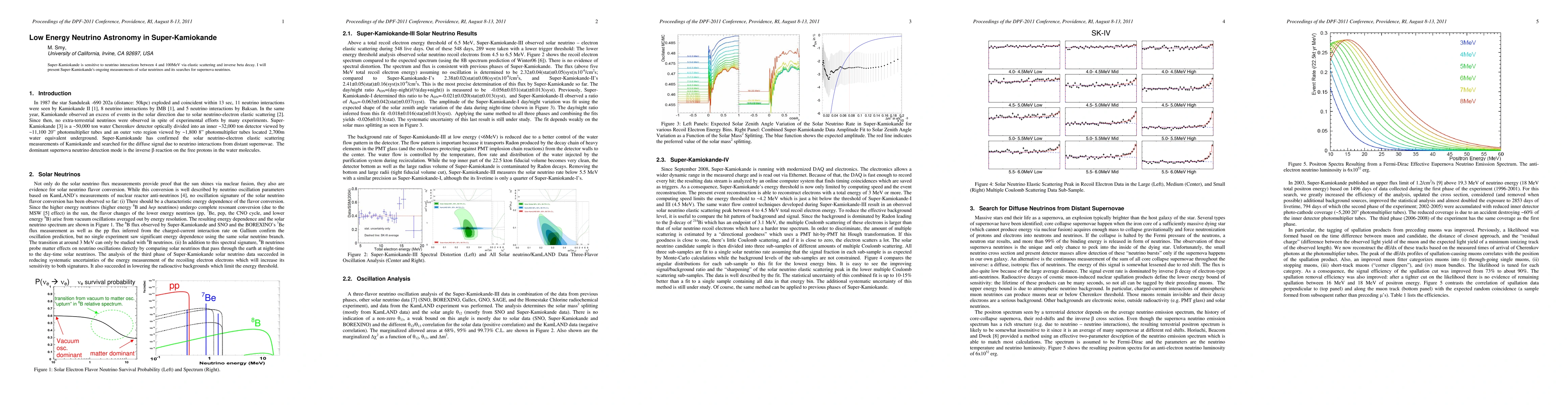 Super-Kamiokande detects low energy neutrinos via elastic scattering and inverse beta decay, with a focus on solar neutrinos and ongoing searches for supernova neutrinos. The results contribute to our understanding of astrophysical neutrino sources.