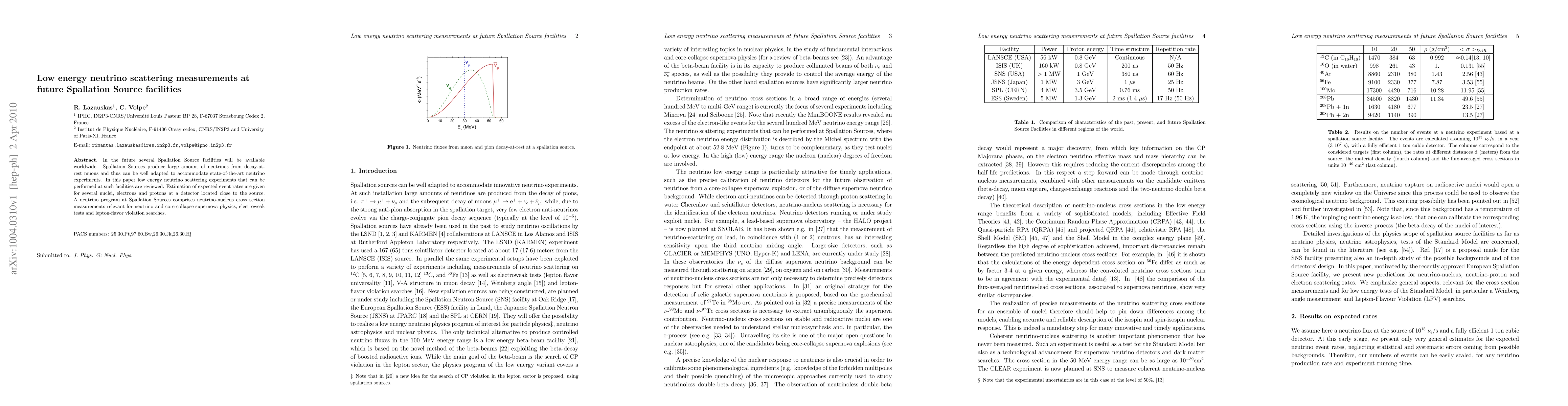 This paper reviews low energy neutrino scattering experiments feasible at future Spallation Source facilities, estimating event rates for various targets. It highlights the potential for neutrino-nucleus cross section measurements, relevant for neutrino physics, supernova studies, and tests of electroweak interactions.