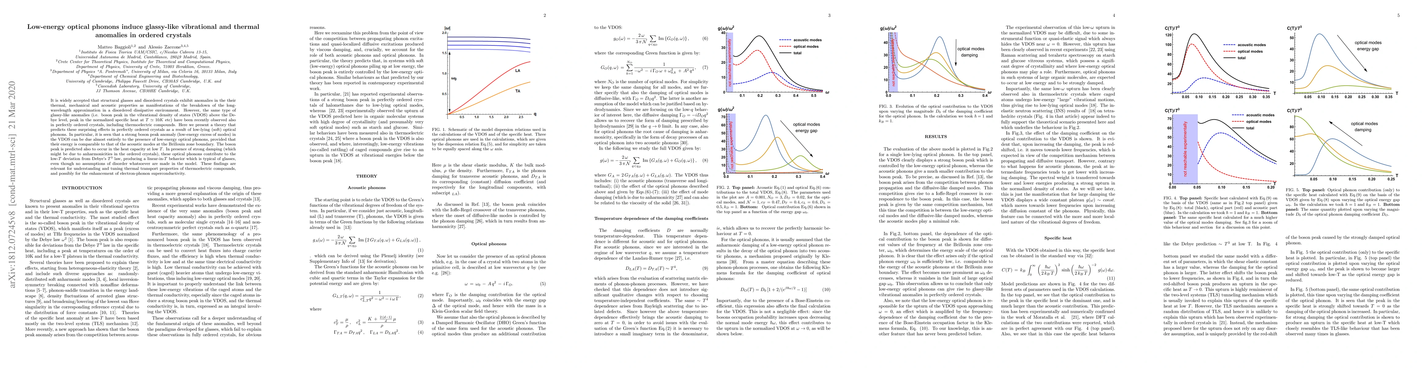 This paper presents a theoretical framework explaining how low-energy optical phonons in ordered crystals can induce glassy-like anomalies, such as a boson peak in the vibrational density of states, similar to those observed in disordered materials. The study suggests that strong damping due to anharmonicities can lead to thermal anomalies typically seen in glasses, even in perfectly ordered crystals.