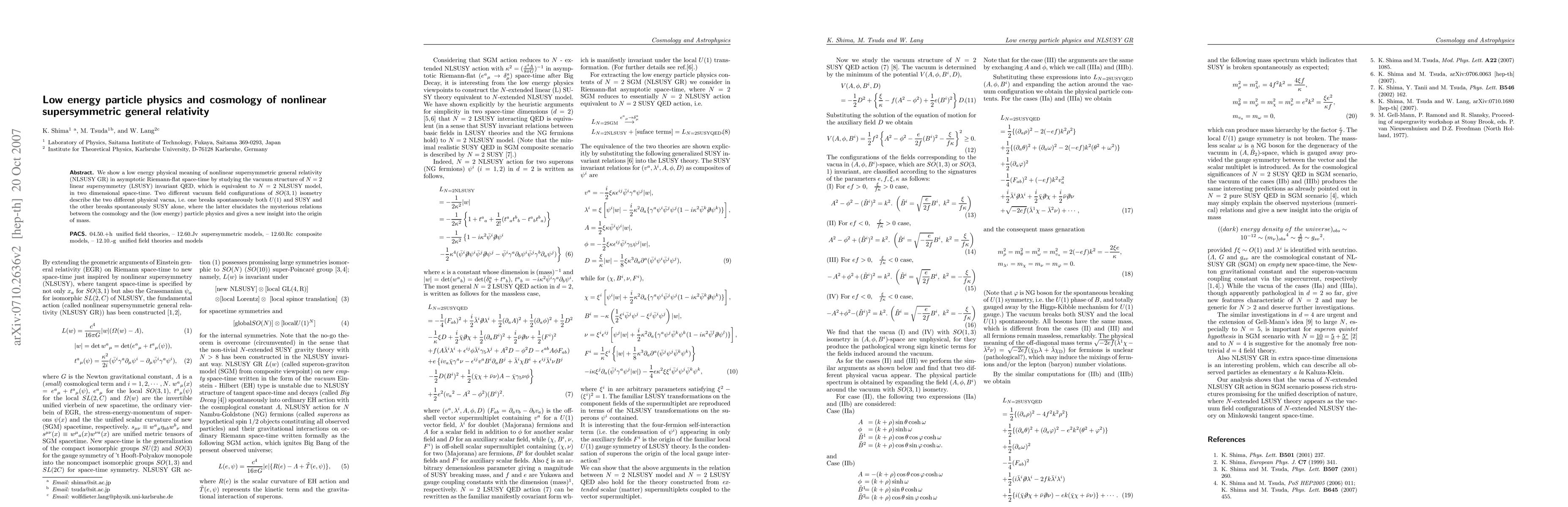 We show a low energy physical meaning of nonlinear supersymmetric general relativity (NLSUSY GR) in asymptotic Riemann-flat space-time by studying the vacuum structure of N = 2 linear supersymmetry (LSUSY) invariant QED, which is equivalent to N = 2 NLSUSY model, in two dimensional space-time. Two different vacuum field configurations of SO(3,1) isometry describe the two different physical vacua, i.e. one breaks spontaneously both U(1) and SUSY and the other breaks spontaneously SUSY alone, where the latter elucidates the mysterious relations between the cosmology and the (low energy) particle physics and gives a new insight into the origin of mass.