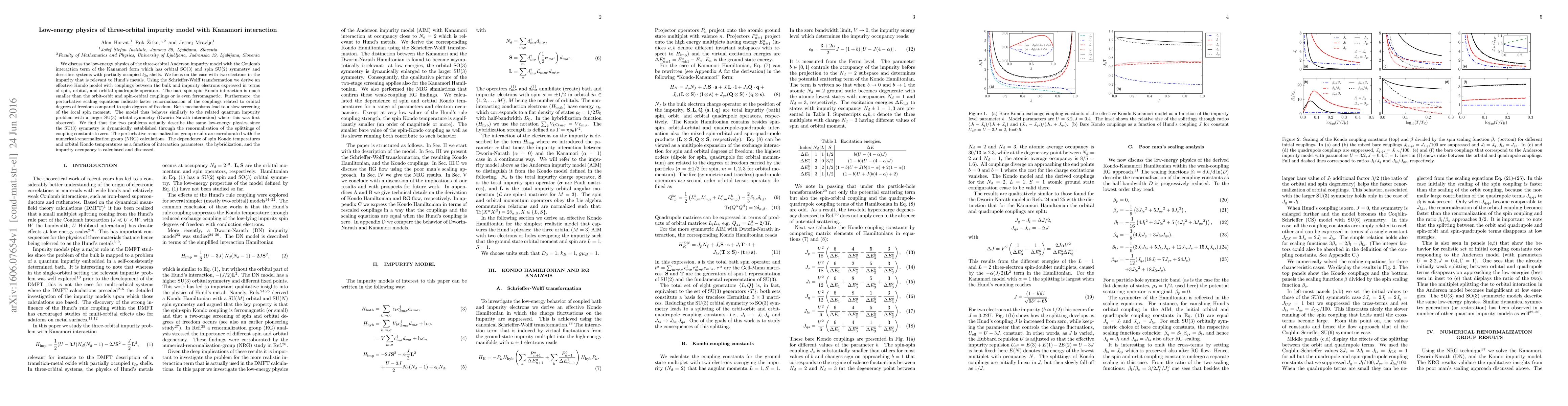 We discuss the low-energy physics of the three-orbital Anderson impurity model with the Coulomb interaction term of the Kanamori form which has orbital SO(3) and spin SU(2) symmetry and describes systems with partially occupied $t_{2g}$ shells. We focus on the case with two electrons in the impurity that is relevant to Hund's metals. Using the Schrieffer-Wolff transformation we derive an effective Kondo model with couplings between the bulk and impurity electrons expressed in terms of spin, orbital, and orbital quadrupole operators. The bare spin-spin Kondo interaction is much smaller than the orbit-orbit and spin-orbital couplings or is even ferromagnetic. Furthermore, the perturbative scaling equations indicate faster renormalization of the couplings related to orbital degrees of freedom compared to spin degrees of freedom. Both mechanisms lead to a slow screening of the local spin moment. The model thus behaves similarly to the related quantum impurity problem with a larger SU(3) orbital symmetry (Dworin-Narath interaction) where this was first observed. We find that the two problems actually describe the same low-energy physics since the SU(3) symmetry is dynamically established through the renormalization of the splittings of coupling constants to zero. The perturbative renormalization group results are corroborated with the numerical-renormalization group (NRG) calculations. The dependence of spin Kondo temperatures and orbital Kondo temperatures as a function of interaction parameters, the hybridization, and the impurity occupancy is calculated and discussed.