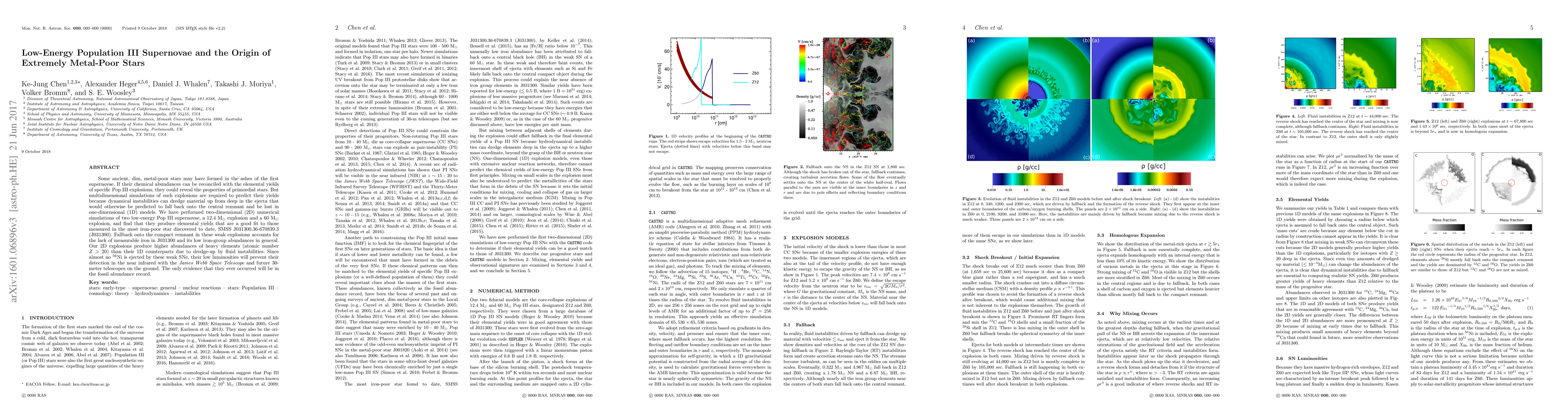 This paper investigates the elemental yields from low-energy Population III supernovae through 2D simulations, finding they match the abundances of extremely metal-poor stars like SMSS J031300. These weak explosions produce higher heavy element abundances than 1D models due to fluid instabilities, but their low luminosity makes them unobservable with current telescopes.