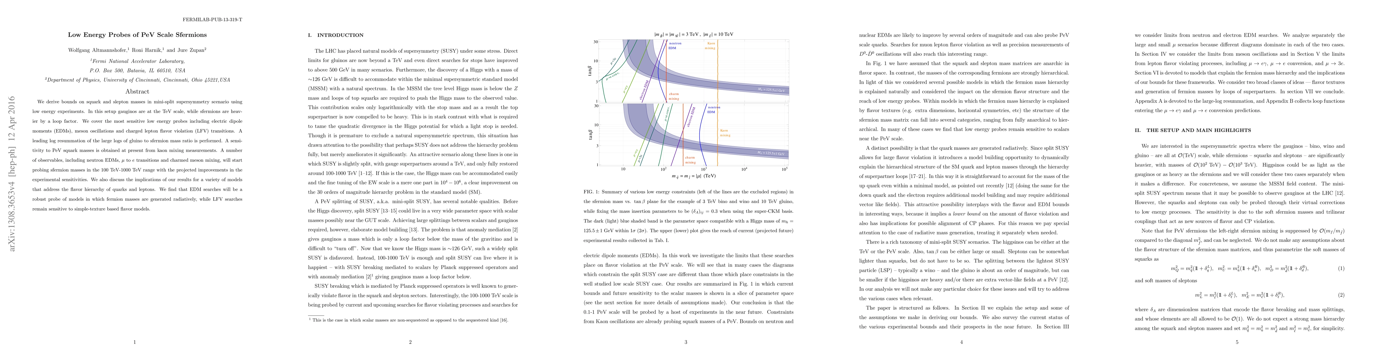 This research derives constraints on squark and slepton masses in mini-split supersymmetry, using low energy experiments. It identifies kaon mixing as currently probing PeV squark masses and anticipates future observables like neutron EDMs, mu->e transitions, and charmed meson mixing to explore sfermion masses in the 100 TeV-1000 TeV range with enhanced sensitivities. The study also examines implications for models addressing quark and lepton flavor hierarchy, suggesting EDM searches as robust probes for radiative fermion mass generation models, and LFV searches for simple-texture based flavor models.