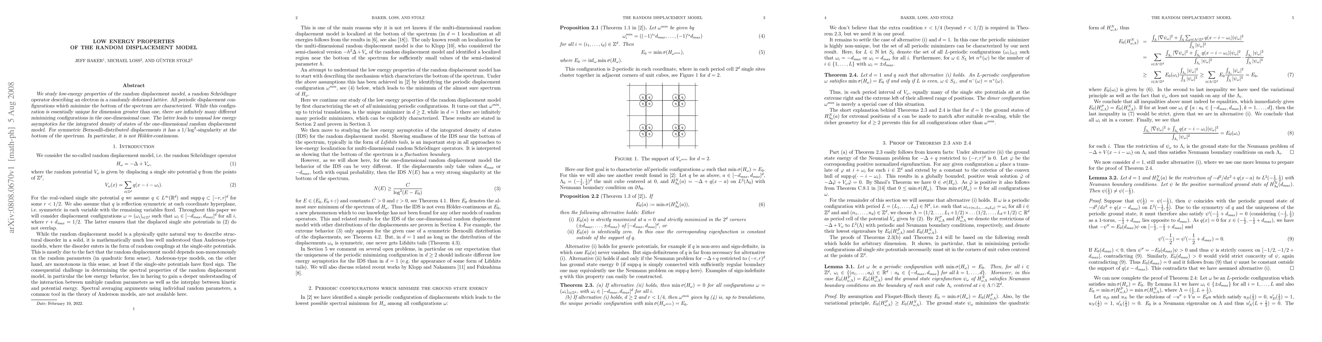 The random displacement model, describing an electron in a randomly deformed lattice, exhibits unique low-energy properties that vary depending on the dimension of the system.