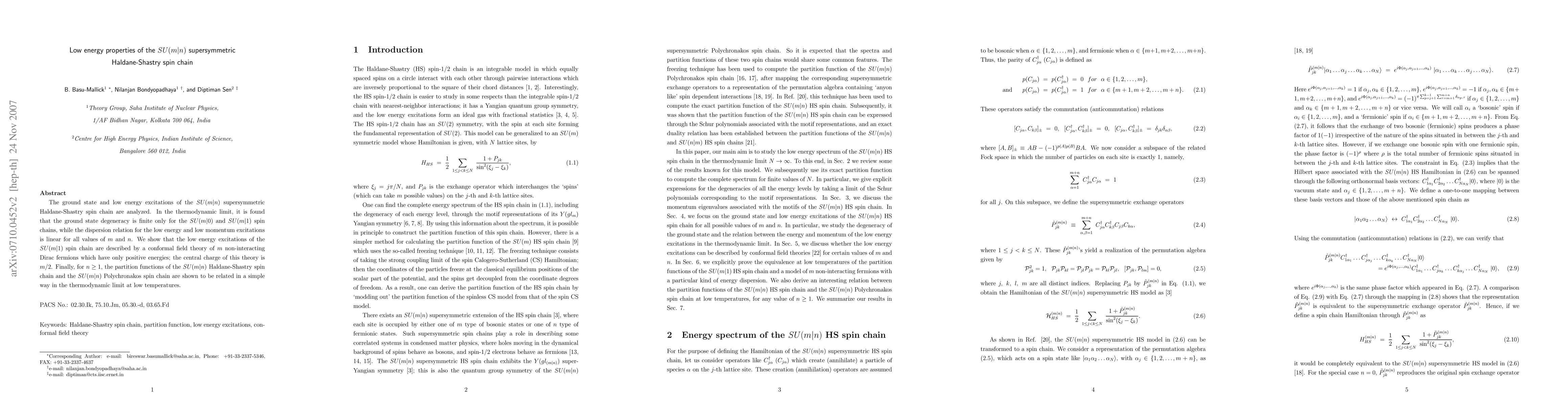 The ground state and low energy excitations of the SU(m|n) supersymmetric Haldane-Shastry spin chain are analyzed. In the thermodynamic limit, it is found that the ground state degeneracy is finite only for the SU(m|0) and SU(m|1) spin chains, while the dispersion relation for the low energy and low momentum excitations is linear for all values of m and n. We show that the low energy excitations of the SU(m|1) spin chain are described by a conformal field theory of m non-interacting Dirac fermions which have only positive energies; the central charge of this theory is m/2. Finally, for n \ge 1, the partition functions of the SU(m|n) Haldane-Shastry spin chain and the SU(m|n) Polychronakos spin chain are shown to be related in a simple way in the thermodynamic limit at low temperatures.