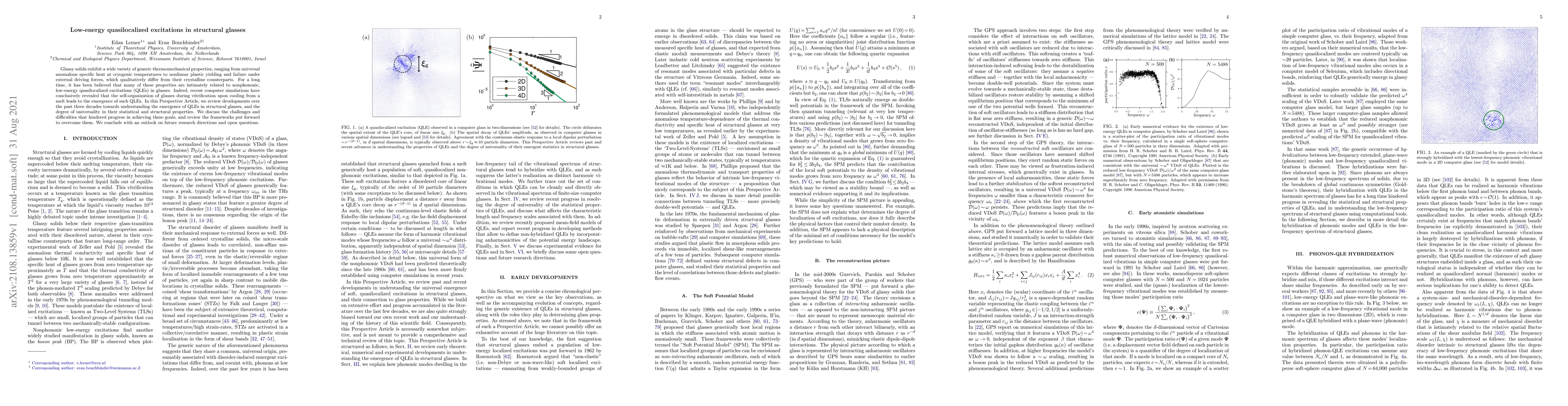 Glassy solids exhibit a wide variety of generic thermomechanical properties, ranging from universal anomalous specific heat at cryogenic temperatures to nonlinear plastic yielding and failure under external driving forces, which qualitatively differ from their crystalline counterparts. For a long time, it has been believed that many of these properties are intimately related to nonphononic, low-energy quasilocalized excitations (QLEs) in glasses. Indeed, recent computer simulations have conclusively revealed that the self-organization of glasses during vitrification upon cooling from a melt leads to the emergence of such QLEs. In this Perspective Article, we review developments over the past three decades towards understanding the emergence of QLEs in structural glasses, and the degree of universality in their statistical and structural properties. We discuss the challenges and difficulties that hindered progress in achieving these goals, and review the frameworks put forward to overcome them. We conclude with an outlook on future research directions and open questions.