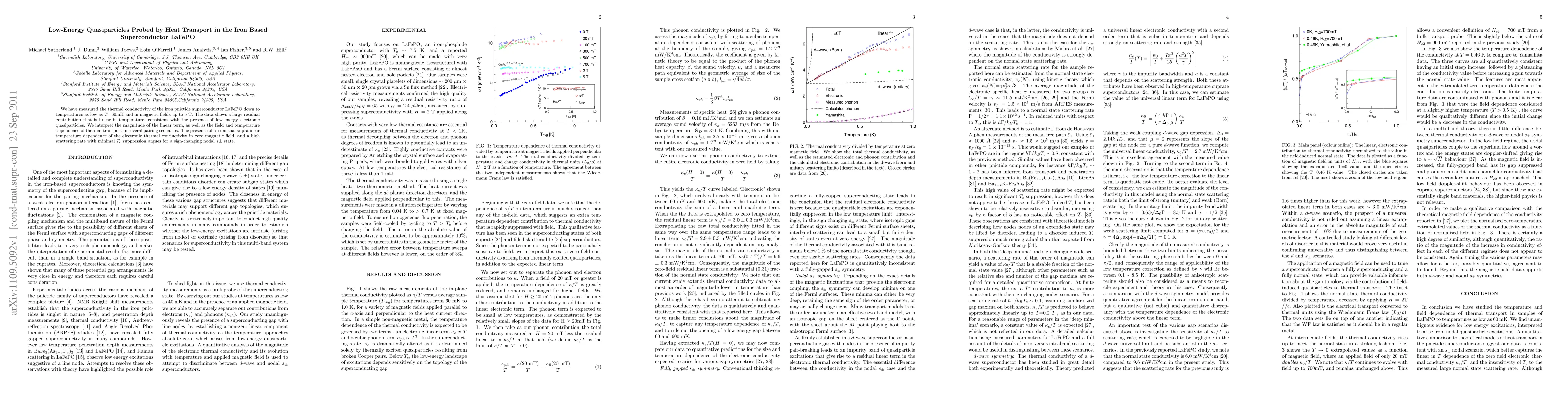 This study investigates the thermal conductivity of the iron-based superconductor LaFePO, revealing a significant residual contribution linear in temperature indicative of low-energy quasiparticles. The findings suggest a sign-changing nodal s+/- pairing state, supported by supralinear temperature dependence and minimal suppression of Tc.