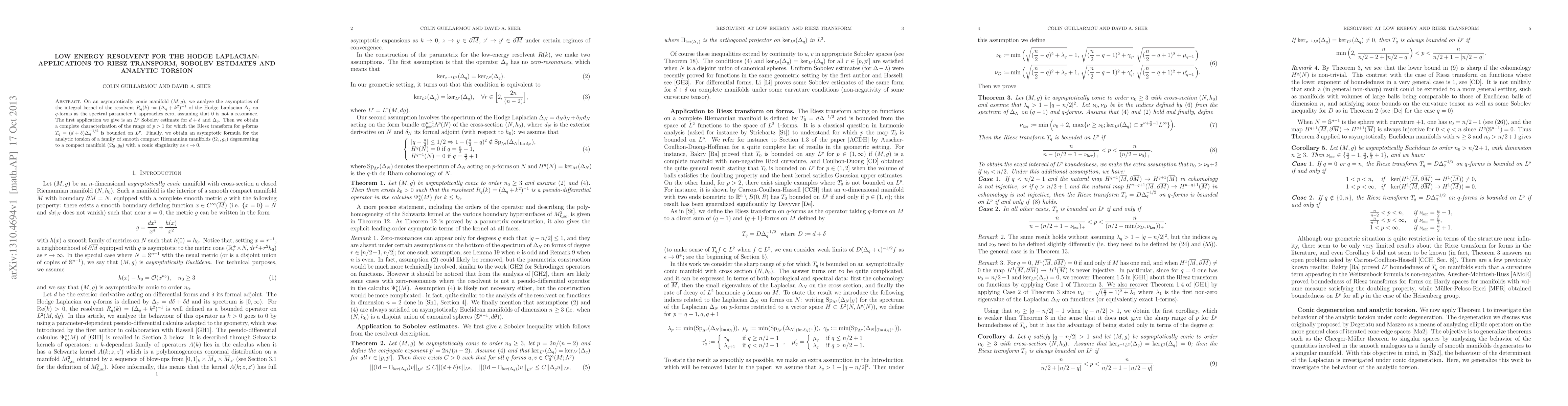 This paper investigates the low energy behavior of the resolvent of the Hodge Laplacian on asymptotically conic manifolds, deriving $L^p$ Sobolev estimates and characterizing the boundedness of the Riesz transform for $q$-forms. It also provides an asymptotic formula for the analytic torsion in families of manifolds with conic singularities.