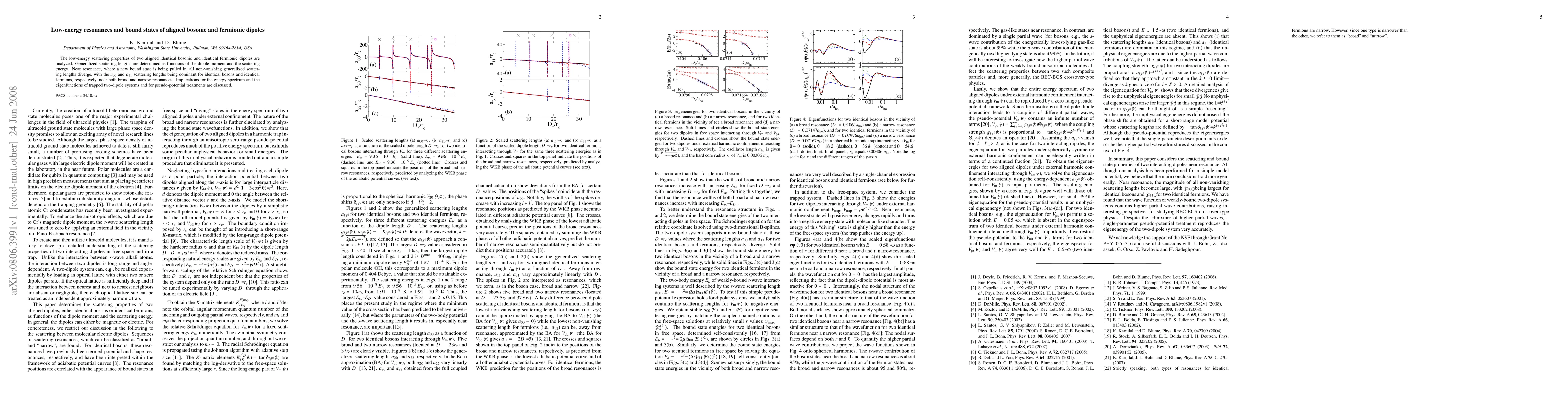 This paper analyzes the low-energy scattering of aligned bosonic and fermionic dipoles, determining generalized scattering lengths that diverge near resonances. It highlights the dominant scattering lengths for bosons and fermions, discussing implications for the energy spectrum and eigenfunctions of trapped two-dipole systems.