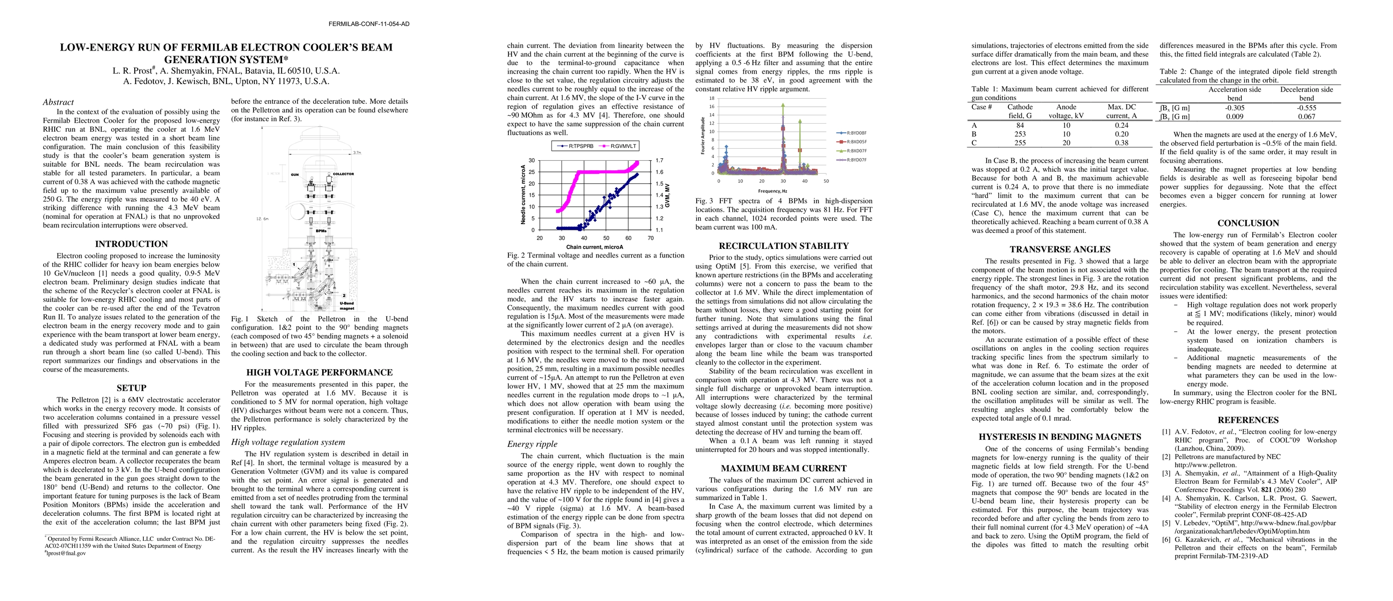 In the context of the evaluation of possibly using the Fermilab Electron Cooler for the proposed low-energy RHIC run at BNL, operating the cooler at 1.6 MeV electron beam energy was tested in a short beam line configuration. The main conclusion of this feasibility study is that the cooler's beam generation system is suitable for BNL needs. The beam recirculation was stable for all tested parameters. In particular, a beam current of 0.38 A was achieved with the cathode magnetic field up to the maximum value presently available of 250 G. The energy ripple was measured to be 40 eV. A striking difference with running the 4.3 MeV beam (nominal for operation at FNAL) is that no unprovoked beam recirculation interruptions were observed.