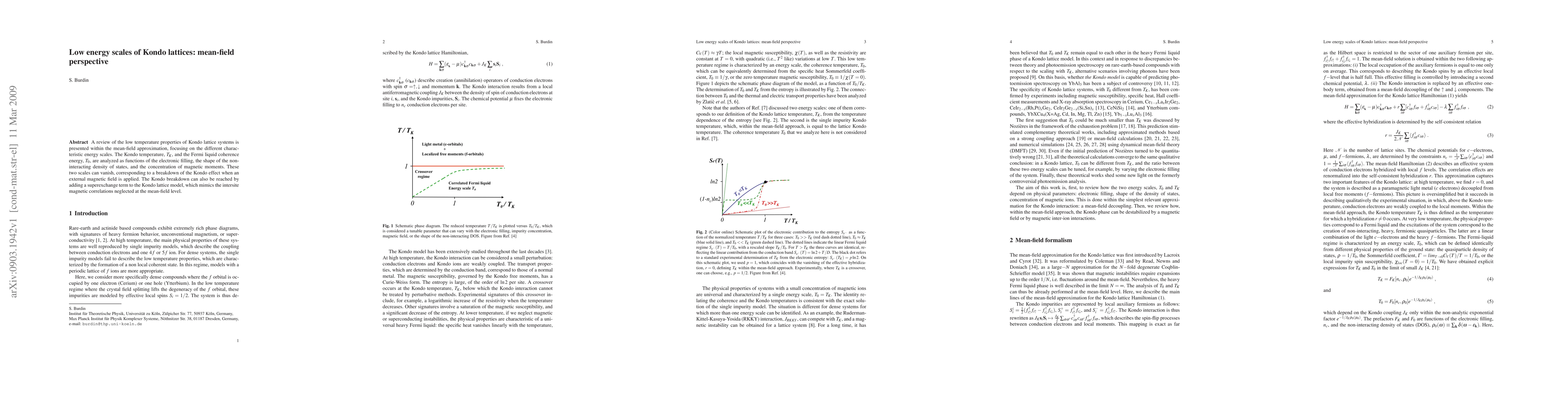 This paper reviews the low-temperature properties of Kondo lattice systems using mean-field theory, analyzing the Kondo temperature and Fermi liquid coherence energy as functions of various parameters. The study highlights how these energy scales can vanish under external magnetic fields or with added superexchange terms, indicating a breakdown of the Kondo effect.