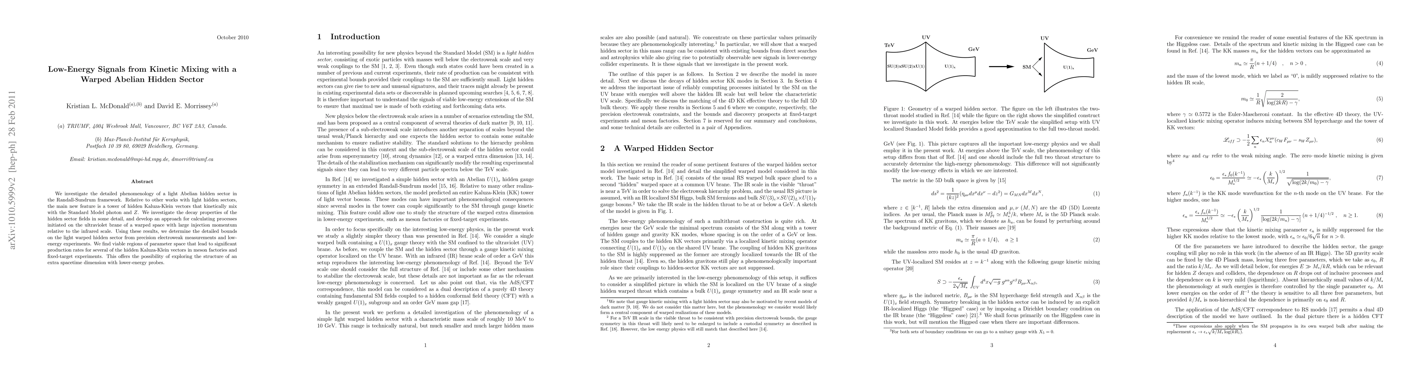 This paper explores the phenomenology of a light Abelian hidden sector in the Randall-Sundrum model, focusing on kinetic mixing between hidden Kaluza-Klein vectors and Standard Model photons/Z bosons. It provides detailed decay properties and bounds from precision measurements, revealing viable parameter spaces for significant production in meson factories and fixed-target experiments.