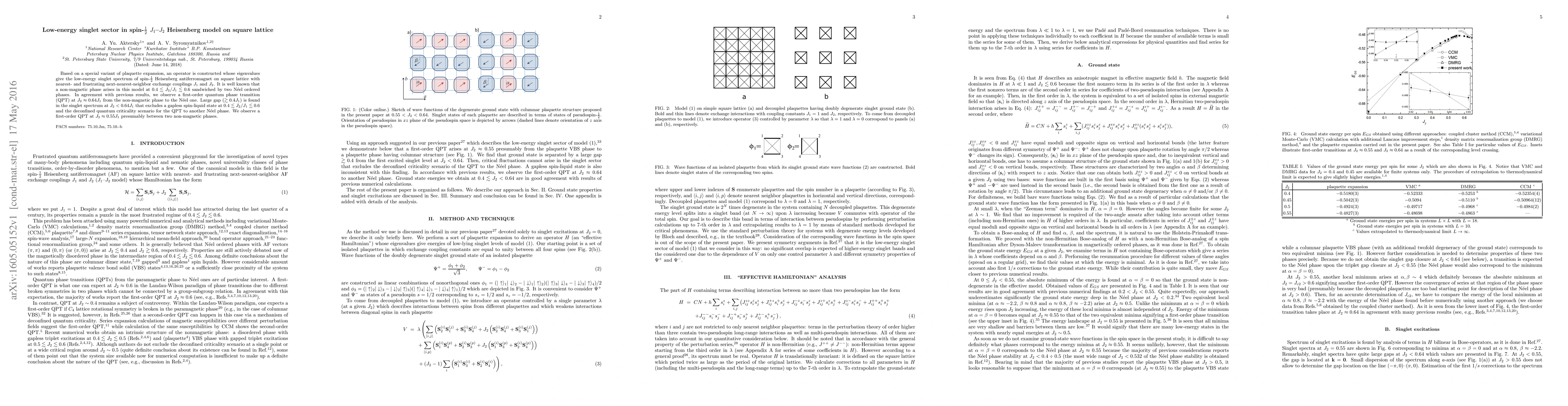 Based on a special variant of plaquette expansion, an operator is constructed whose eigenvalues give the low-energy singlet spectrum of spin-$\frac12$ Heisenberg antiferromagnet on square lattice with nearest- and frustrating next-nearest-neighbor exchange couplings $J_1$ and $J_2$. It is well known that a non-magnetic phase arises in this model at $0.4\lesssim J_2/J_1\lesssim 0.6$ sandwiched by two N\'eel ordered phases. In agreement with previous results, we observe a first-order quantum phase transition (QPT) at $J_2\approx 0.64J_1$ from the non-magnetic phase to the N\'eel one. Large gap ($\gtrsim0.4J_1$) is found in the singlet spectrum at $J_2<0.64J_1$ that excludes a gapless spin-liquid state at $0.4\lesssim J_2/J_1\lesssim 0.6$ and the deconfined quantum criticality scenario for the QPT to another N\'eel phase. We observe a first-order QPT at $J_2\approx 0.55J_1$ presumably between two non-magnetic phases.
