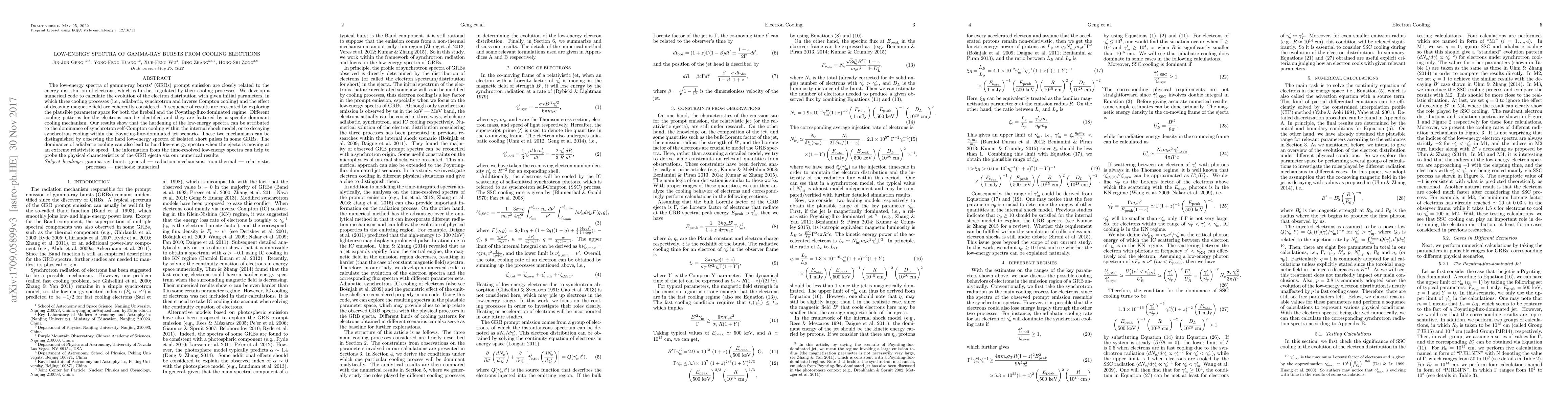 The low-energy spectra of gamma-ray bursts' (GRBs) prompt emission are closely related to the energy distribution of electrons, which is further regulated by their cooling processes. We develop a numerical code to calculate the evolution of the electron distribution with given initial parameters, in which three cooling processes (i.e., adiabatic, synchrotron and inverse Compton cooling) and the effect of decaying magnetic field are coherently considered. A sequence of results are presented by exploring the plausible parameter space for both the fireball and the Poynting-flux-dominated regime. Different cooling patterns for the electrons can be identified and they are featured by a specific dominant cooling mechanism. Our results show that the hardening of the low-energy spectra can be attributed to the dominance of synchrotron self-Compton cooling within the internal shock model, or to decaying synchrotron cooling within the Poynting-flux-dominated jet scenario. These two mechanisms can be distinguished by observing the hard low-energy spectra of isolated short pulses in some GRBs. The dominance of adiabatic cooling can also lead to hard low-energy spectra when the ejecta is moving at an extreme relativistic speed. The information from the time-resolved low-energy spectra can help to probe the physical characteristics of the GRB ejecta via our numerical results.