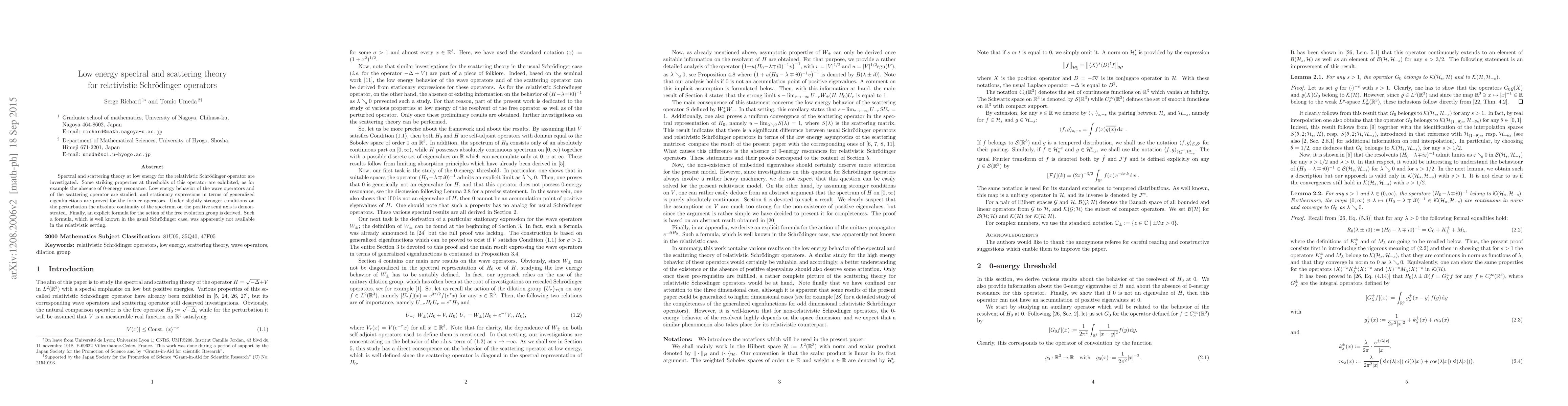 This paper investigates the spectral and scattering theory for low energy relativistic Schrödinger operators, highlighting unique properties like the absence of 0-energy resonance. It provides stationary expressions for wave operators and proves the absolute continuity of the spectrum under stronger perturbation conditions, along with an explicit formula for the free evolution group action in the relativistic context.