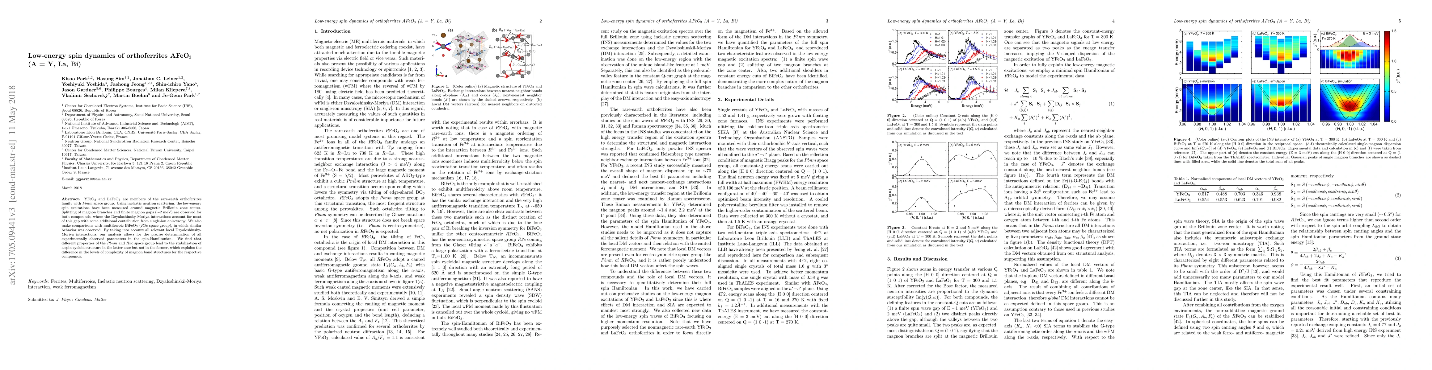 Researchers studied low-energy spin dynamics in orthoferrites AFeO3 (A = Y, La, Bi) using inelastic neutron scattering, finding a non-zero magnon gap similar to multiferroic BiFeO3, and demonstrating the importance of Dzyaloshinsky-Moriya interactions and single-ion anisotropy.
