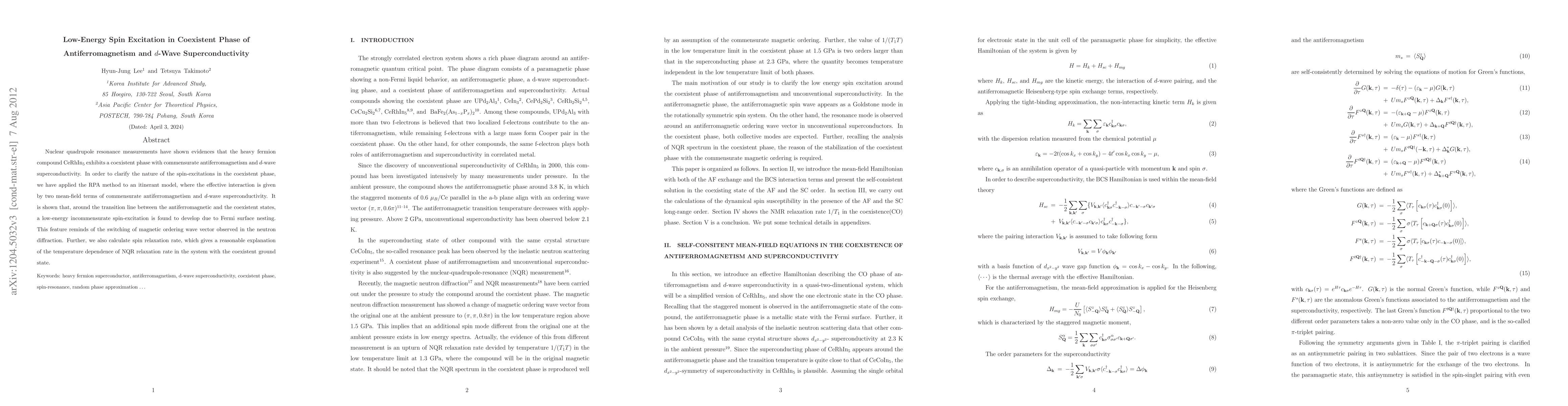 Nuclear quadrupole resonance measurements have shown evidences that the heavy fermion compound CeRhIn$_5$ exhibits a coexistent phase with commensurate antiferromagnetism and d-wave superconductivity. In order to clarify the nature of the spin-excitations in the coexistent phase, we have applied the RPA method to an itinerant model, where the effective interaction is given by two mean-field terms of commensurate antiferromagnetism and d-wave superconductivity. It is shown that, around the transition line between the antiferromagnetic and the coexistent states, a low-energy incommensurate spin-excitation is found to develop due to Fermi surface nesting. This feature reminds of the switching of magnetic ordering wave vector observed in the neutron diffraction. Further, we also calculate spin relaxation rate, which gives a reasonable explanation of the temperature dependence of NQR relaxation rate in the system with the coexistent ground state.