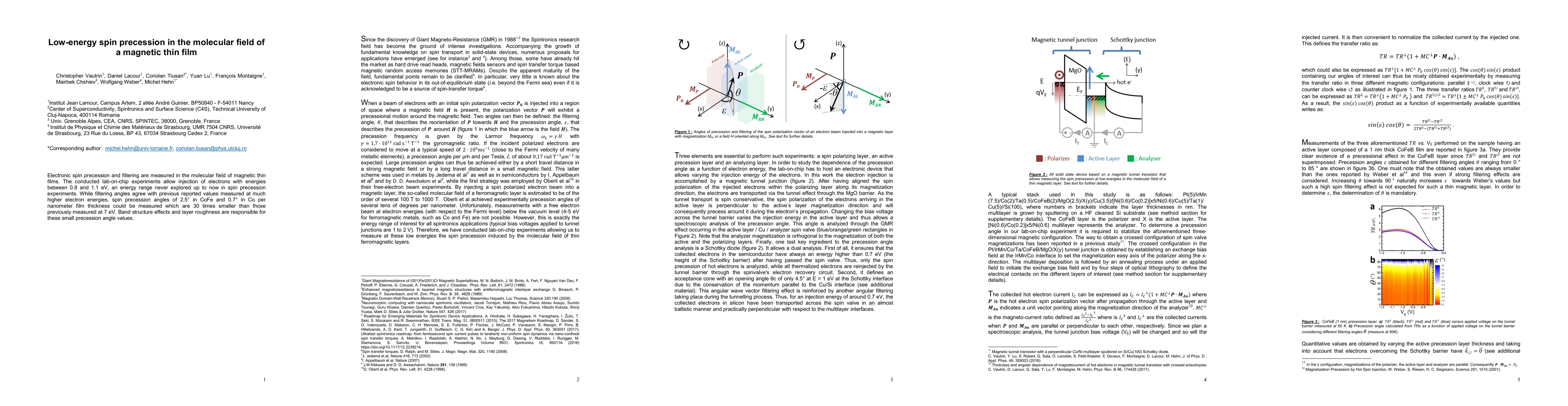 Electronic spin precession and filtering are measured in the molecular field of magnetic thin films. The conducted lab-on-chip experiments allow injection of electrons with energies between 0.8 and 1.1 eV, an energy range never explored up to now in spin precession experiments. While filtering angles agree with previous reported values measured at much higher electron energies, spin precession angles of 2.5{\deg} in CoFe and 0.7{\deg} in Co per nanometer film thickness could be measured which are 30 times smaller than those previously measured at 7 eV. Band structure effects and layer roughness are responsible for these small precession angle values.