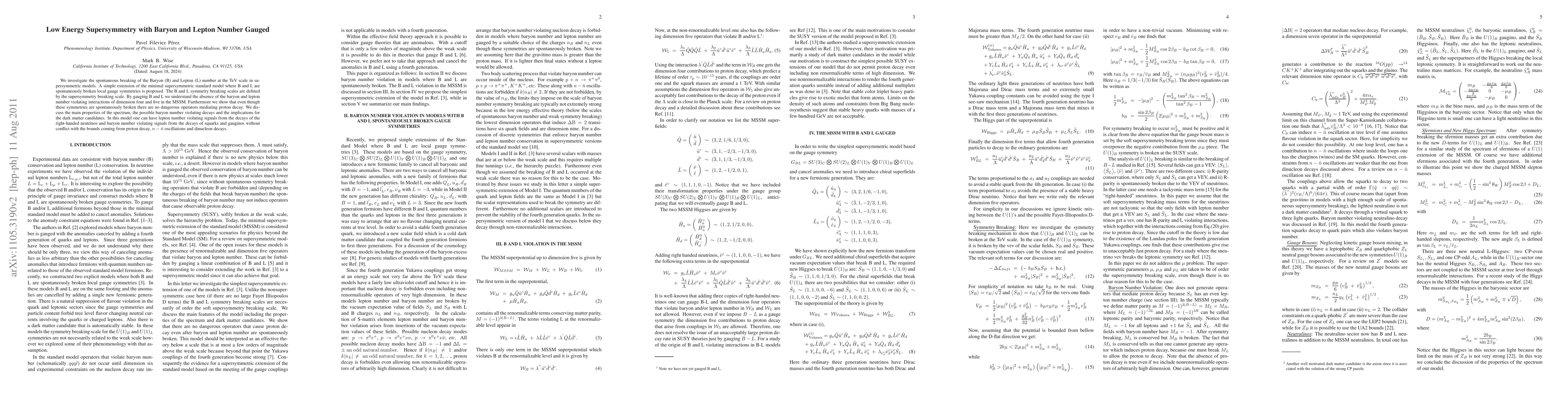 This paper explores a supersymmetric model where Baryon (B) and Lepton (L) numbers are spontaneously broken at the TeV scale, ensuring no dimension-four or five baryon/lepton number violating interactions. It discusses the spectrum, decay properties, and implications for dark matter, concluding that the model can allow for lepton and baryon number violating signals without violating proton decay bounds.