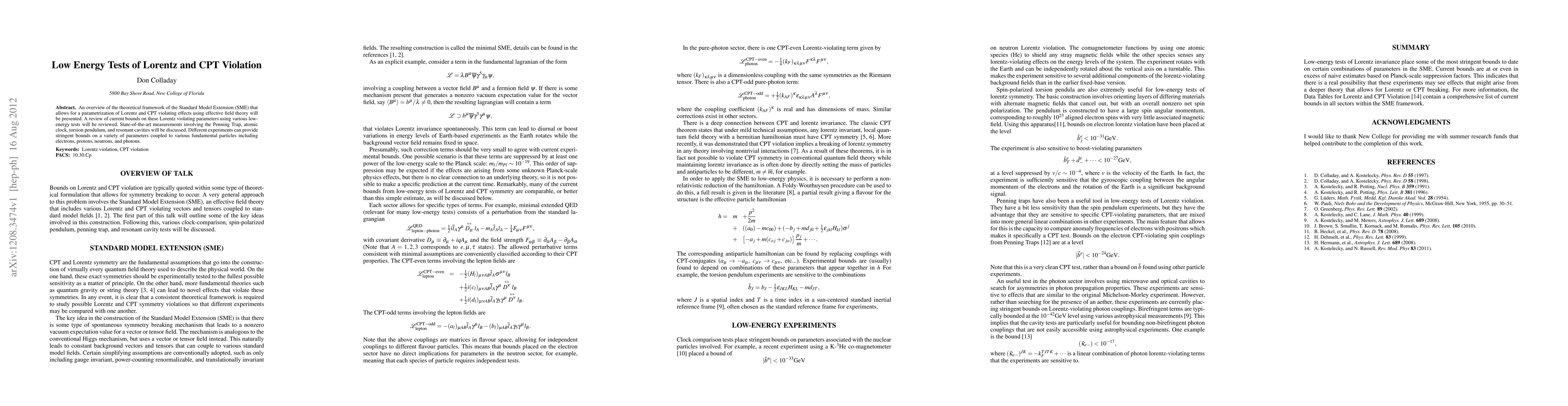 This paper outlines the Standard Model Extension (SME) framework for testing Lorentz and CPT violation using low-energy experiments. It reviews current bounds on Lorentz violating parameters from tests like Penning Trap, atomic clock, torsion pendulum, and resonant cavities, emphasizing their role in constraining parameters related to fundamental particles.