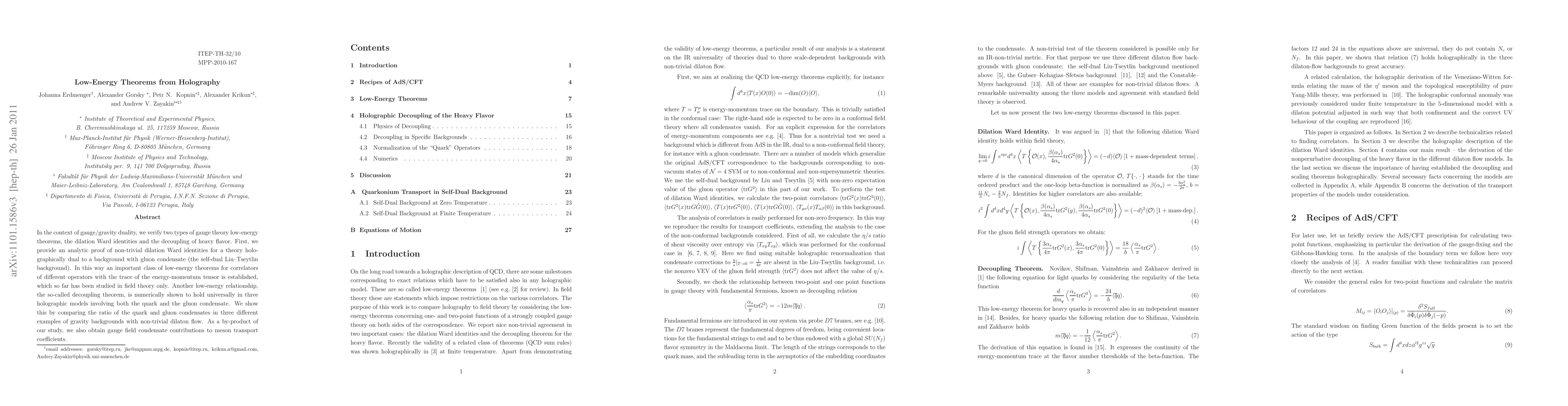 In the context of gauge/gravity duality, we verify two types of gauge theory low-energy theorems, the dilation Ward identities and the decoupling of heavy flavor. First, we provide an analytic proof of non-trivial dilation Ward identities for a theory holographically dual to a background with gluon condensate (the self-dual Liu--Tseytlin background). In this way an important class of low-energy theorems for correlators of different operators with the trace of the energy-momentum tensor is established, which so far has been studied in field theory only. Another low-energy relationship, the so-called decoupling theorem, is numerically shown to hold universally in three holographic models involving both the quark and the gluon condensate. We show this by comparing the ratio of the quark and gluon condensates in three different examples of gravity backgrounds with non-trivial dilaton flow. As a by-product of our study, we also obtain gauge field condensate contributions to meson transport coefficients.
