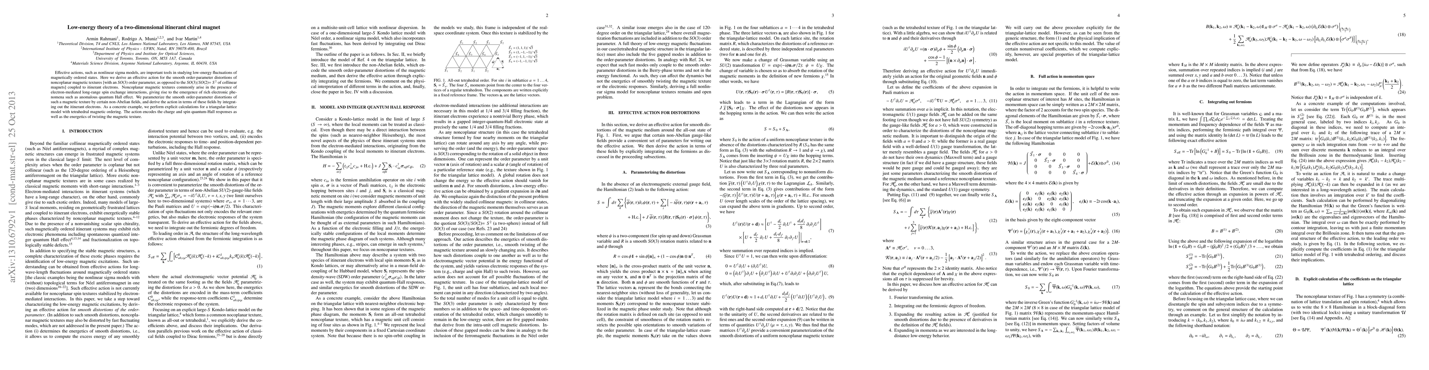 Effective actions, such as nonlinear sigma models, are important tools in studying low-energy fluctuations of magnetically ordered states. Here we derive an effective action for the smooth order-parameter distortions of noncoplanar magnetic textures [with an SO(3) order parameter, as opposed to the SO(3)/SO(2)=S^2 of collinear magnets] coupled to itinerant electrons. Noncoplanar magnetic textures commonly arise in the presence of electron-mediated long-range spin exchange interactions, giving rise to the emergence of rich electronic phenomena such as anomalous quantum Hall effect. We parameterize the smooth order-parameter distortions of such a magnetic texture by certain non-Abelian fields, and derive the action in terms of these fields by integrating out the itinerant electrons. As a concrete example, we perform explicit calculations for a triangular-lattice model with tetrahedral magnetic ordering. The action encodes the charge and spin quantum-Hall responses as well as the energetics of twisting the magnetic texture.