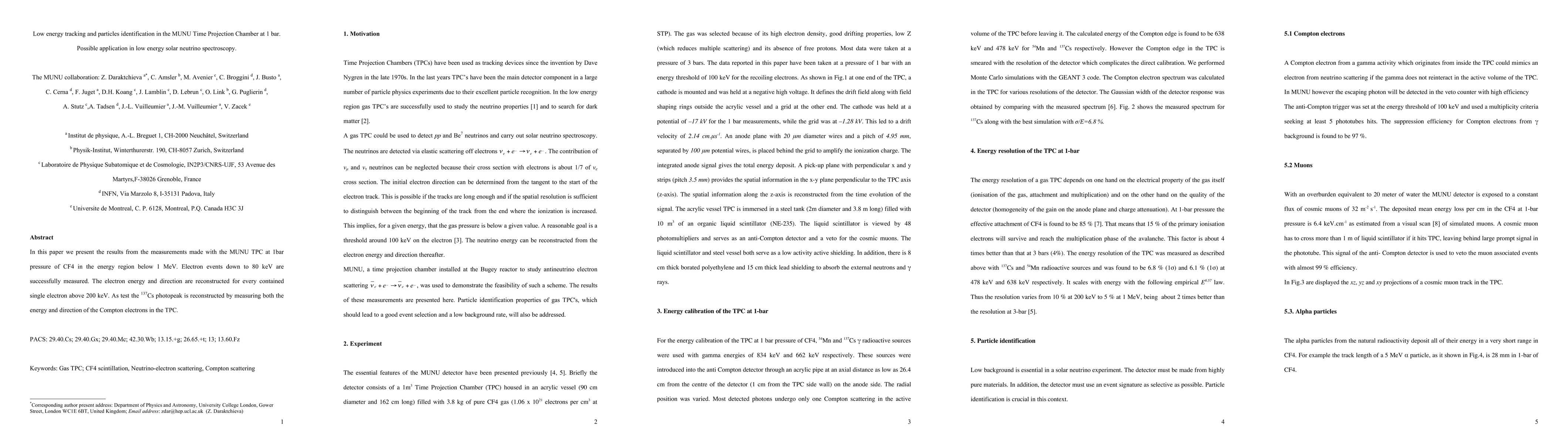 In this paper we present the results from the measurements made with the MUNU TPC at 1bar pressure of CF4 in the energy region below 1 MeV. Electron events down to 80 keV are successfully measured. The electron energy and direction are reconstructed for every contained single electron above 200 keV. As test the 137Cs photopeak is reconstructed by measuring both the energy and direction of the Compton electrons in the TPC.