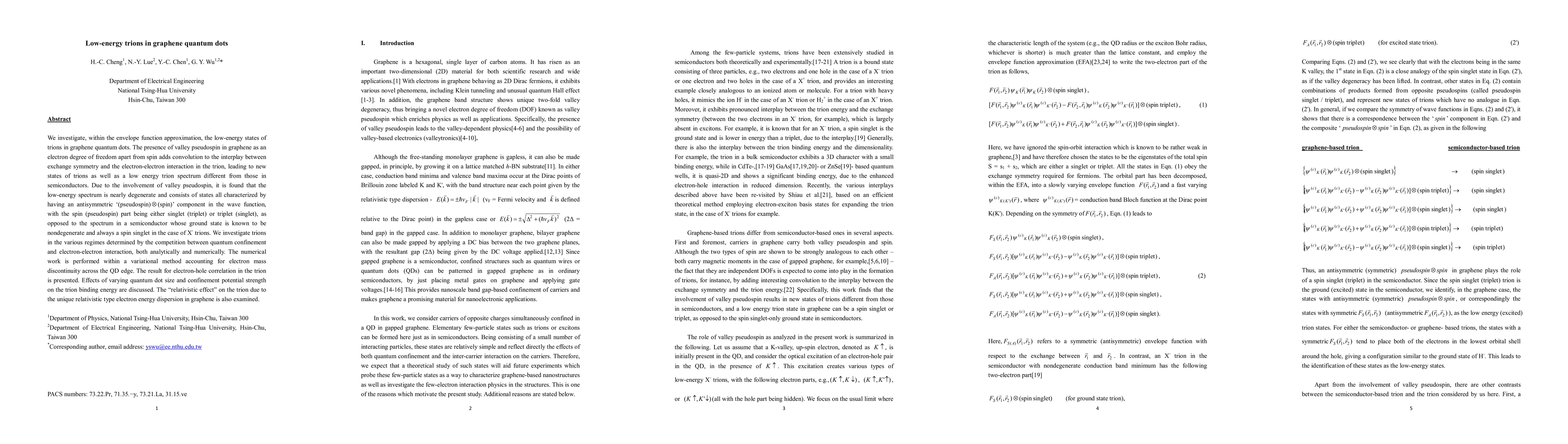 This paper explores low-energy states of trions in graphene quantum dots, revealing a nearly degenerate spectrum due to valley pseudospin, contrasting with the nondegenerate spectrum of semiconductor trions. The study combines analytical and numerical methods to analyze the interplay between quantum confinement and electron-electron interactions, highlighting the impact of varying quantum dot size and confinement potential on trion binding energy.