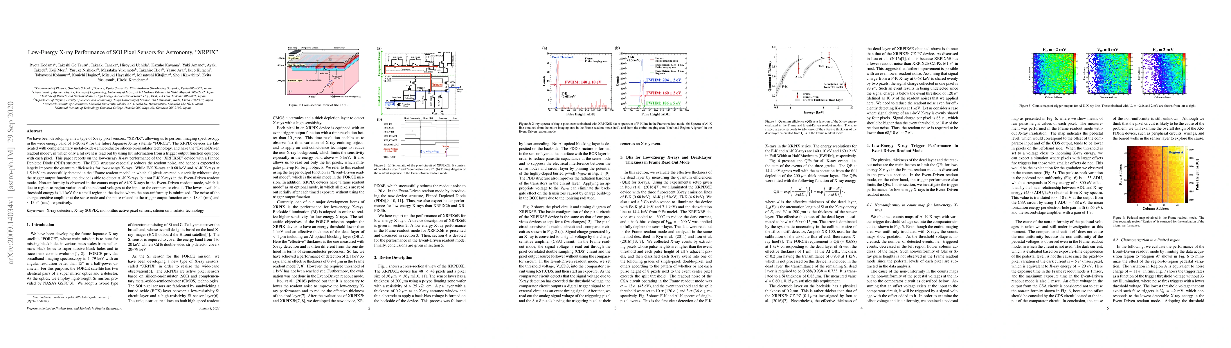 The research presents the 'XRPIX6E' X-ray pixel sensor, fabricated using SOI technology, designed for low-energy X-ray detection in the 1-20 keV range for the FORCE satellite. The sensor's Event-Driven readout mode successfully detects Al-K X-rays at 1.5 keV and F-K X-rays at 0.68 keV in Frame readout mode. However, in Event-Driven mode, while Al-K X-rays are detected, F-K X-rays aren't, due to regional variations in pedestal voltages. The lowest threshold energy achievable is 1.1 keV, with charge sensitive amplifier and trigger output function noises at ~18e- (rms) and ~13e- (rms) respectively.