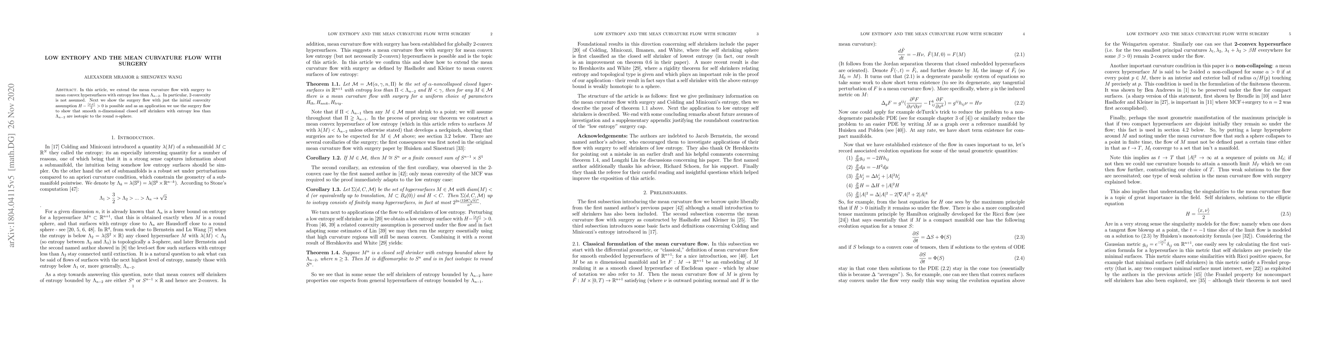 This paper extends the mean curvature flow with surgery to mean convex hypersurfaces with low entropy, demonstrating that the surgery flow is viable under minimal initial convexity conditions. It concludes by proving that smooth $n$-dimensional closed self-shrinkers with entropy less than $\Lambda_{n-2}$ are isotopic to the round $n$-sphere.