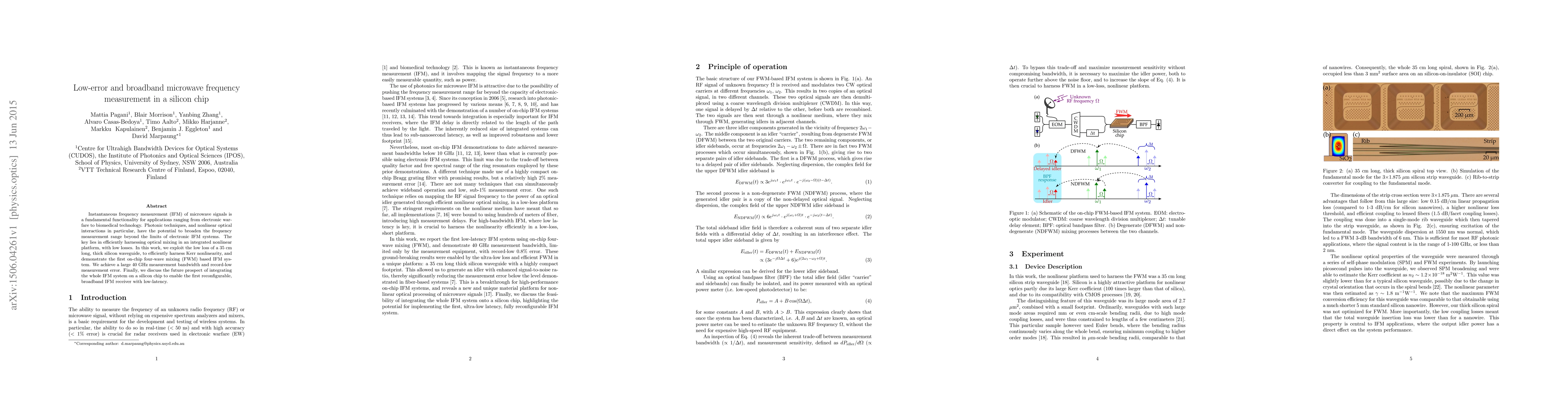 This paper presents an on-chip four-wave mixing (FWM) based instantaneous frequency measurement (IFM) system using a low-loss silicon waveguide, achieving a 40 GHz bandwidth and record-low error, with potential for future reconfigurable, broadband IFM receivers.