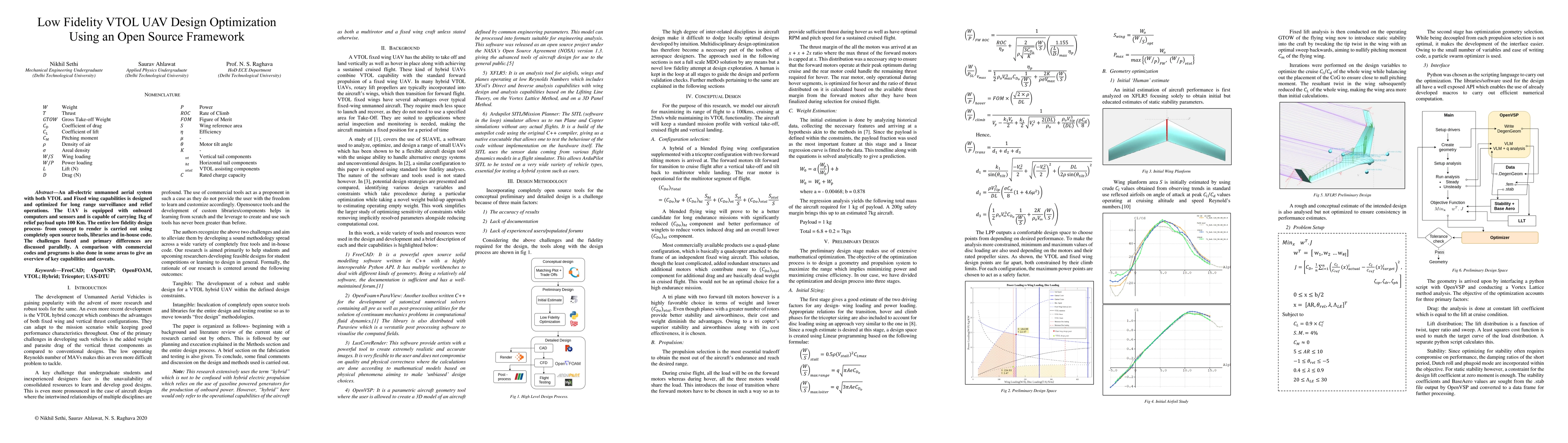 This paper details the design and optimization of a low fidelity, all-electric VTOL UAV using open source tools for long-range surveillance and relief operations, capable of carrying 1kg payload up to 100 Km. It compares open source design to commercial alternatives, highlighting challenges and differences.