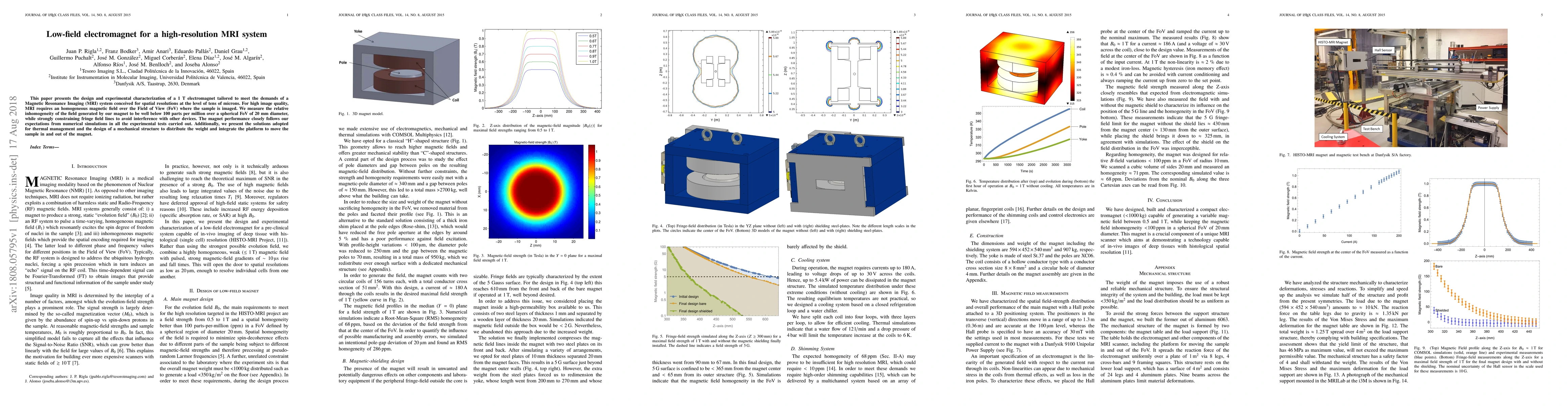 A new low-field electromagnet design achieved a high-resolution MRI system with an inhomogeneous magnetic field less than 100 ppm over a 20mm diameter FoV, exceeding expectations from numerical simulations.