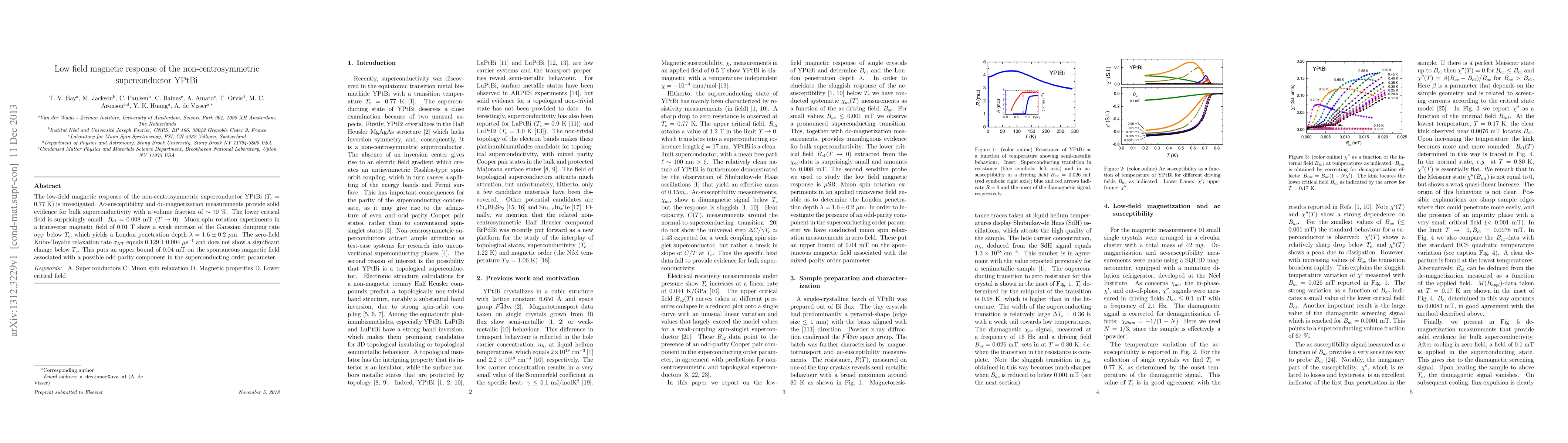This paper investigates the low-field magnetic response of the non-centrosymmetric superconductor YPtBi, revealing bulk superconductivity with a volume fraction of ~70% and a surprisingly small lower critical field of $B_{c1} = 0.008$ mT. The study finds no significant change in the zero-field Kubo-Toyabe relaxation rate below $T_c$, placing an upper bound of 0.04 mT on the spontaneous magnetic field.