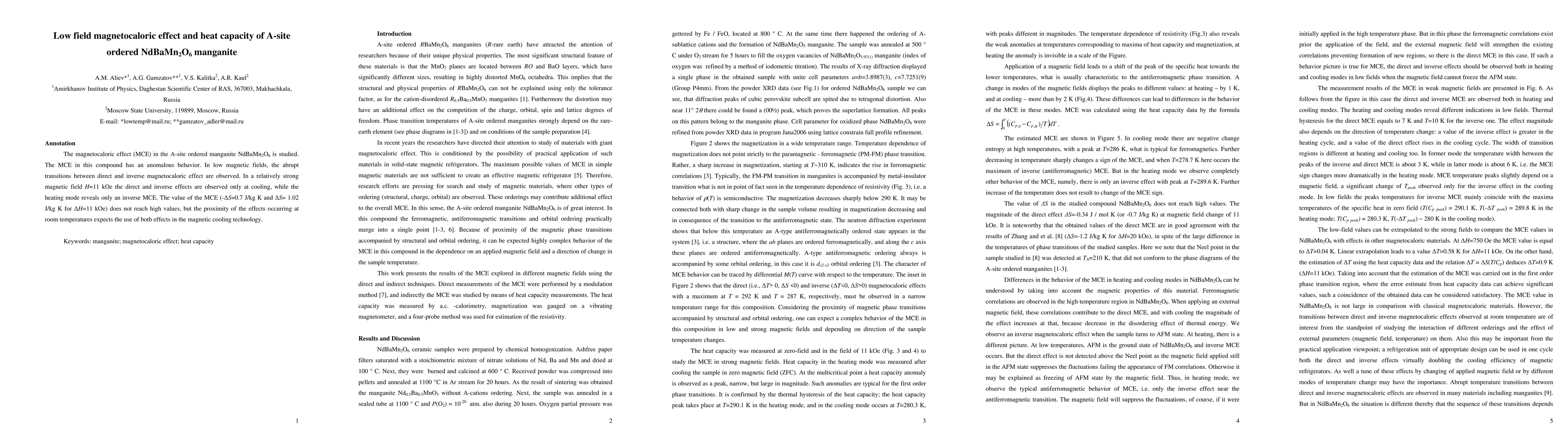 This study investigates the magnetocaloric effect in NdBaMn2O6 manganite, revealing anomalous behavior with abrupt transitions between direct and inverse effects in low magnetic fields. Although the MCE values are modest, the effects occurring near room temperature suggest potential applications in magnetic cooling technology.