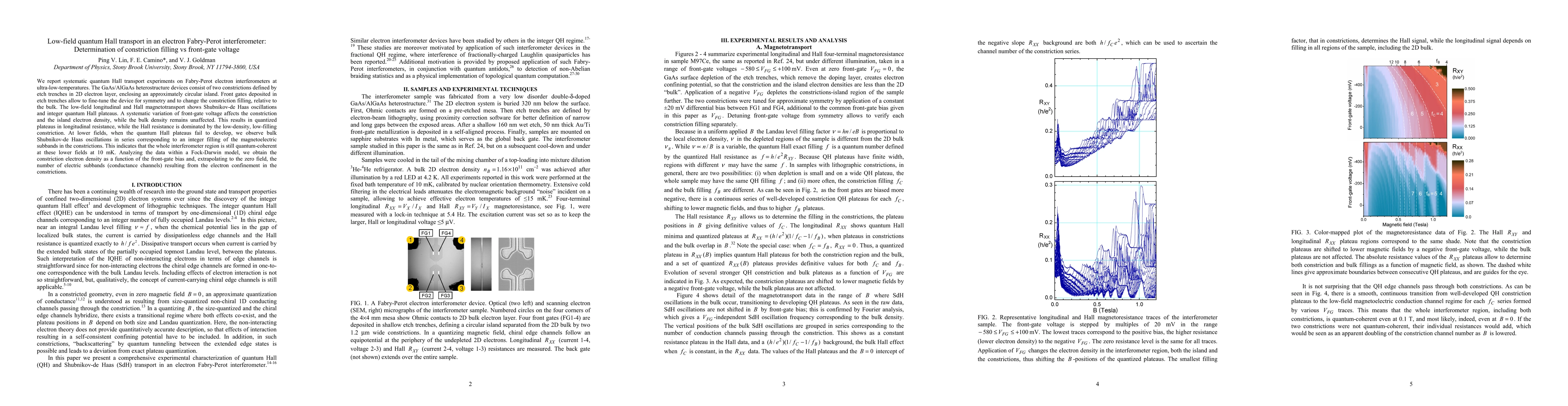 We report systematic quantum Hall transport experiments on Fabry-Perot electron interferometers at ultra-low-temperatures. The GaAs/AlGaAs heterostructure devices consist of two constrictions defined by etch trenches in 2D electron layer, enclosing an approximately circular island. Front gates deposited in etch trenches allow to fine-tune the device for symmetry and to change the constriction filling, relative to the bulk. The low-field longitudinal and Hall magnetotransport shows Shubnikov-de Haas oscillations and integer quantum Hall plateaus. A systematic variation of front-gate voltage affects the constriction and the island electron density, while the bulk density remains unaffected. This results in quantized plateaus in longitudinal resistance, while the Hall resistance is dominated by the low-density, low-filling constriction. At lower fields, when the quantum Hall plateaus fail to develop, we observe bulk Shubnikov-de Haas oscillations in series corresponding to an integer filling of the magnetoelectric subbands in the constrictions. This indicates that the whole interferometer region is still quantum-coherent at these lower fields at 10 mK. Analyzing the data within a Fock-Darwin model, we obtain the constriction electron density as a function of the front gate bias and, extrapolating to the zero field, the number of electric subbands (conductance channels) resulting from the electron confinement in the constrictions.