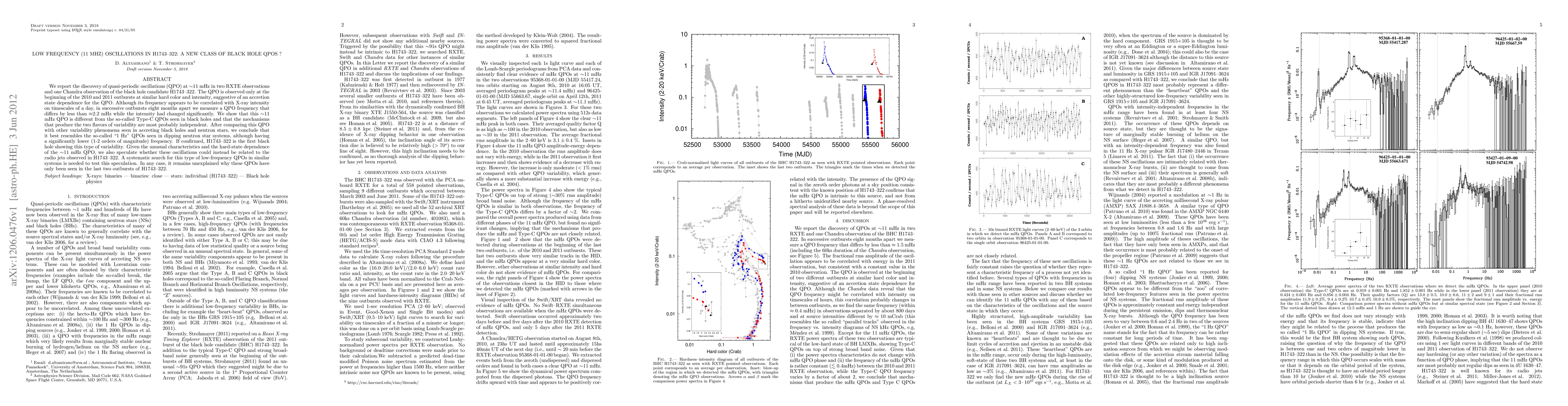 We report the discovery of quasi-periodic oscillations (QPO) at ~11 mHz in two RXTE observations and one Chandra observation of the black hole candidate H1743-322. The QPO is observed only at the beginning of the 2010 and 2011 outbursts at similar hard colour and intensity, suggestive of an accretion state dependence for the QPO. Although its frequency appears to be correlated with X-ray intensity on timescales of a day, in successive outbursts eight months apart we measure a QPO frequency that differs by less than ~2.2 mHz while the intensity had changed significantly. We show that this ~11 mHz QPO is different from the so-called Type-C QPOs seen in black holes and that the mechanisms that produce the two flavours of variability are most probably independent. After comparing this QPO with other variability phenomena seen in accreting black holes and neutron stars, we conclude that it best resembles the so-called "1 Hz" QPOs seen in dipping neutron star systems, although having a significantly lower (1-2 orders of magnitude) frequency. If confirmed, H1743-322 is the first black hole showing this type of variability. Given the unusual characteristics and the hard-state dependence of the ~11 mHz QPO, we also speculate whether these oscillations could instead be related to the radio jets observed in H1743-322. A systematic search for this type of low-frequency QPOs in similar systems is needed to test this speculation. In any case, it remains unexplained why these QPOs have only been seen in the last two outbursts of H1743-322.