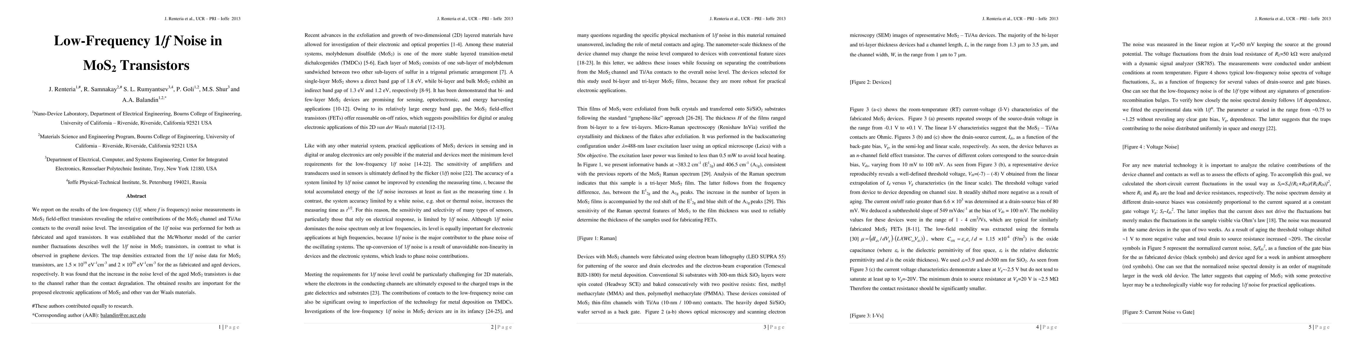 This paper investigates low-frequency 1/f noise in MoS2 transistors, showing that the McWhorter model accurately describes the noise. It finds that aged devices exhibit higher noise due to channel degradation rather than contact degradation, which is crucial for MoS2's electronic applications.