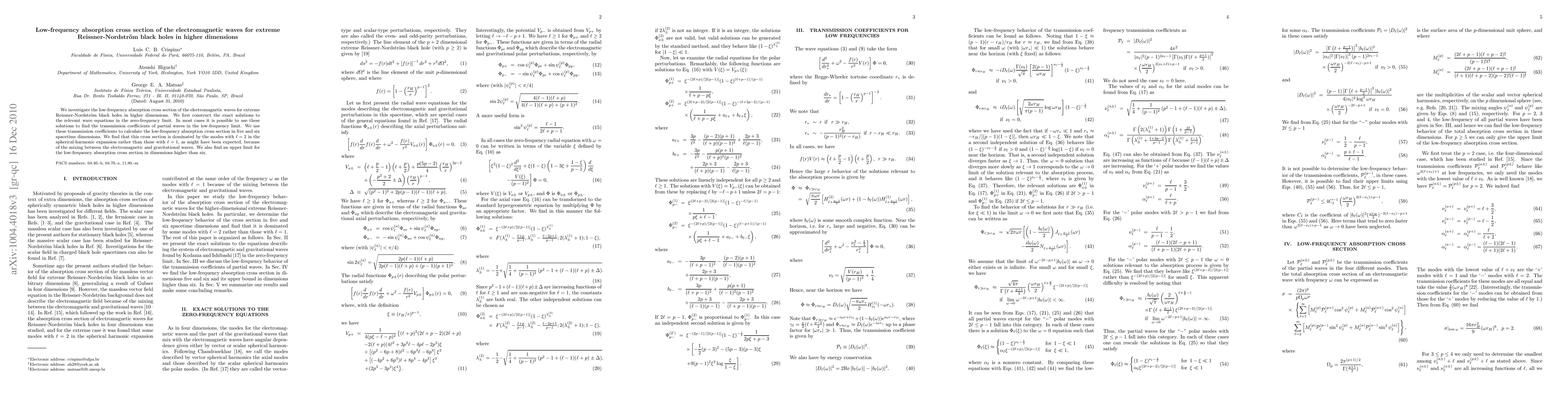 This paper investigates the low-frequency absorption cross section of electromagnetic waves by extreme Reissner-Nordstrom black holes in higher dimensions, finding that l=2 modes dominate absorption due to wave mixing, and establishes an upper limit for absorption in dimensions higher than six.