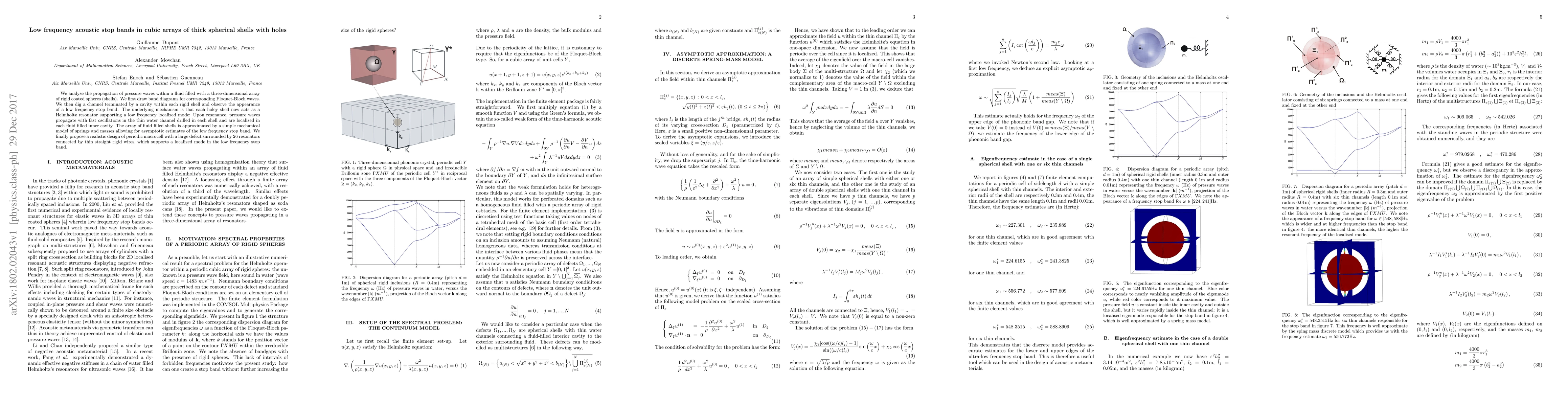 This paper investigates the low frequency acoustic stop bands in cubic arrays of thick spherical shells with holes, revealing that the presence of holes creates Helmholtz resonators that localize pressure waves, leading to a stop band. A mechanical model of springs and masses is used to estimate these effects, and a practical design of a periodic macrocell is proposed.