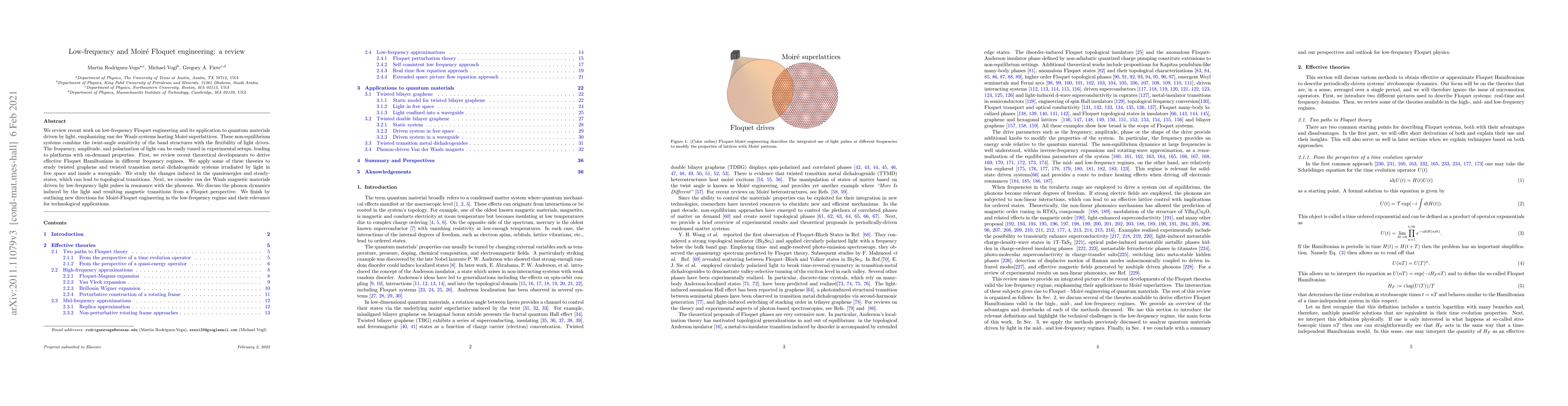 This paper reviews recent advancements in low-frequency Floquet engineering applied to quantum materials, particularly van der Waals systems with Moir\'e superlattices. It discusses theoretical developments for effective Floquet Hamiltonians and their application to twisted graphene and transition metal dichalcogenides, highlighting induced topological transitions and phonon dynamics in magnetic materials.