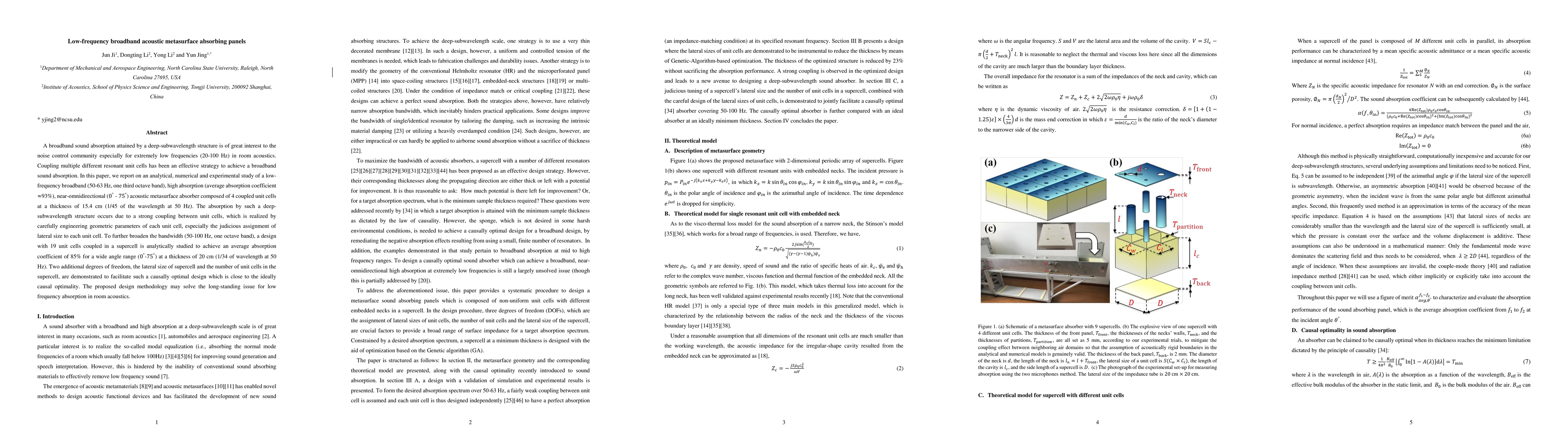 This paper presents a low-frequency broadband acoustic metasurface absorber achieving high absorption (93%) in a narrow band (50-63 Hz) through coupling of 4 unit cells, and further broadens the bandwidth to 50-100 Hz with an average absorption coefficient of 85% using 19 unit cells in a supercell design. The methodology addresses the challenge of low-frequency noise control in room acoustics.