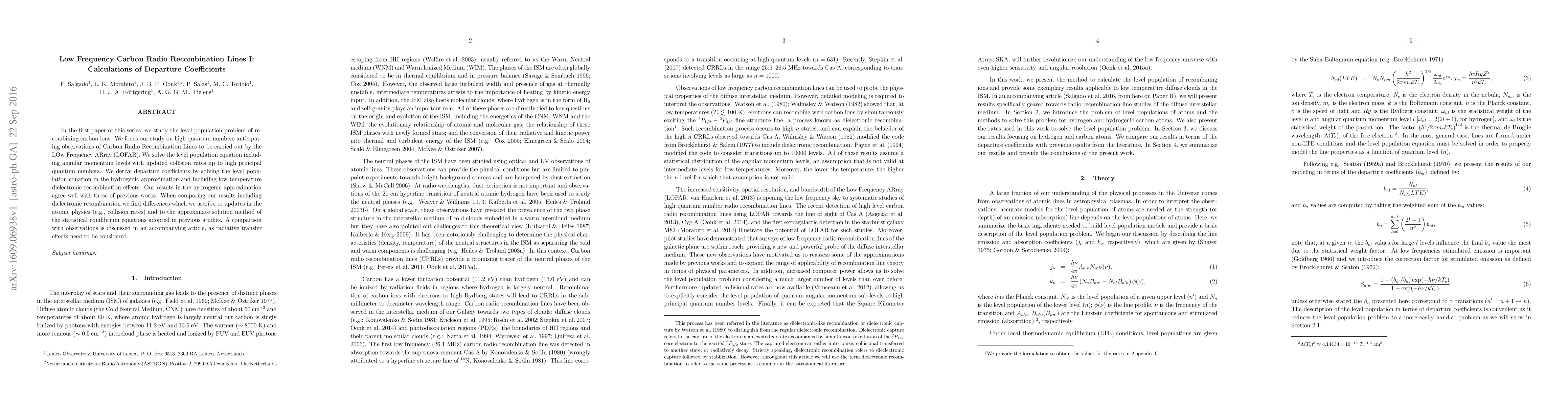This paper calculates departure coefficients for low-frequency carbon radio recombination lines, focusing on high quantum numbers relevant for LOFAR observations. It updates collision rates and includes low-temperature dielectronic recombination effects, finding differences from previous results due to improved atomic physics and solution methods.