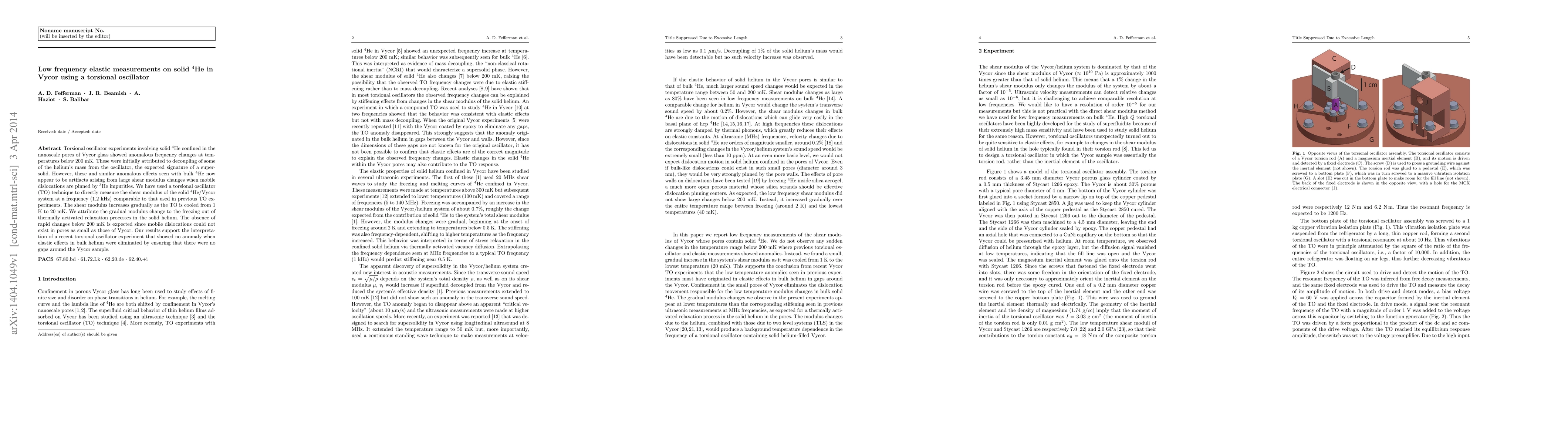 The research utilized a torsional oscillator (TO) technique to measure the shear modulus of solid $^{4}$He confined in Vycor glass at low temperatures (down to 20 mK) and a frequency of 1.2 kHz, similar to previous TO experiments.