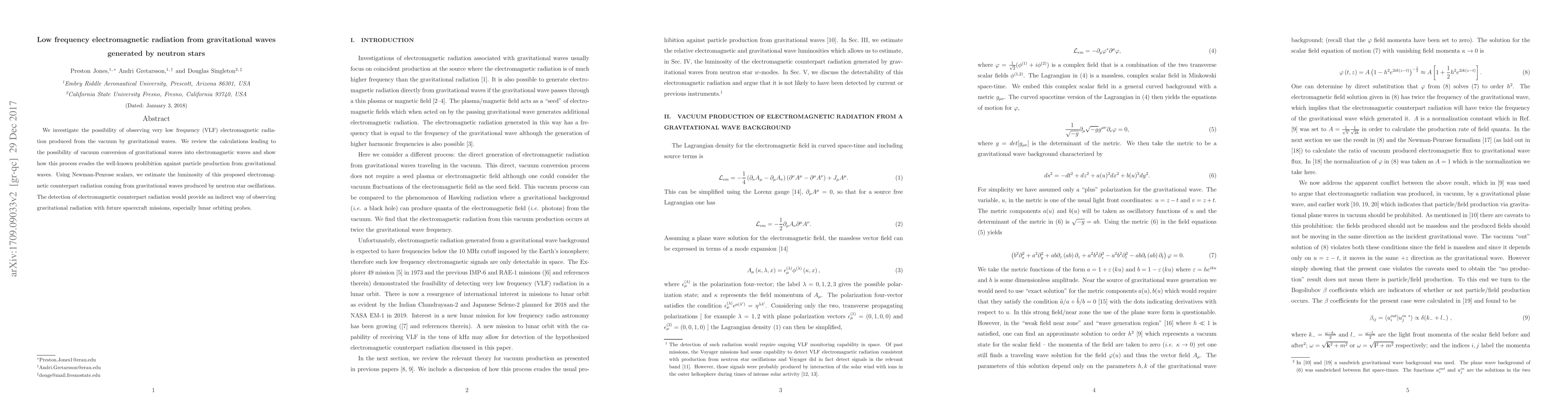 This paper explores the potential for detecting very low frequency electromagnetic radiation generated by gravitational waves from neutron stars. It reviews theoretical calculations suggesting the vacuum conversion of gravitational waves into electromagnetic waves, estimating the luminosity of this radiation and discussing its observability with future lunar orbiting probes.