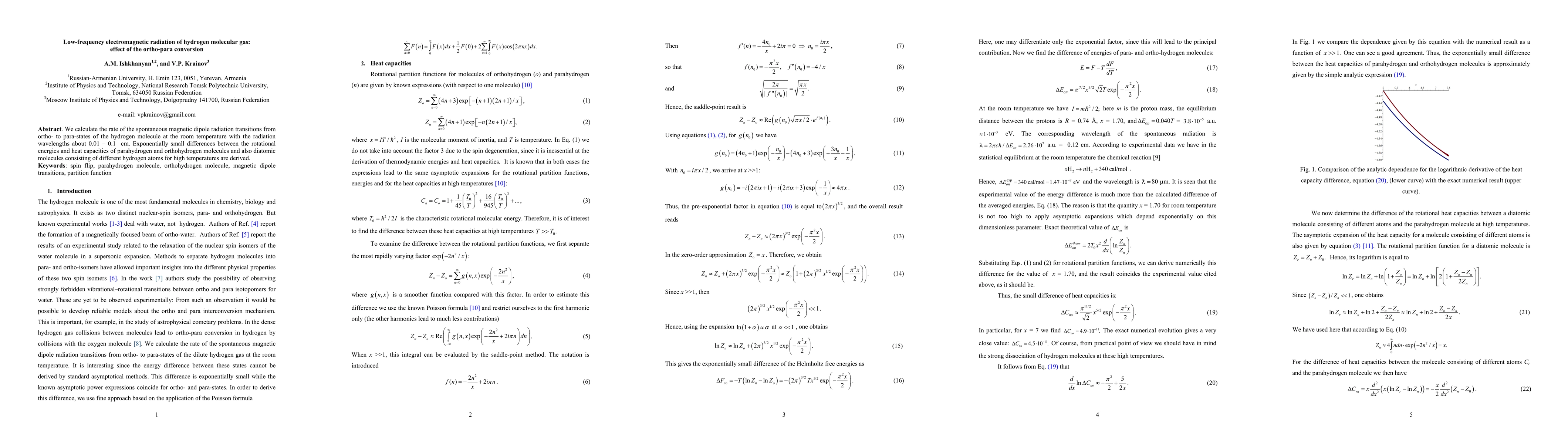 This study calculates the rate of magnetic dipole radiation transitions between ortho- and para-states of hydrogen molecules at room temperature. It finds exponential differences in rotational energies and heat capacities between parahydrogen and orthohydrogen molecules at high temperatures.
