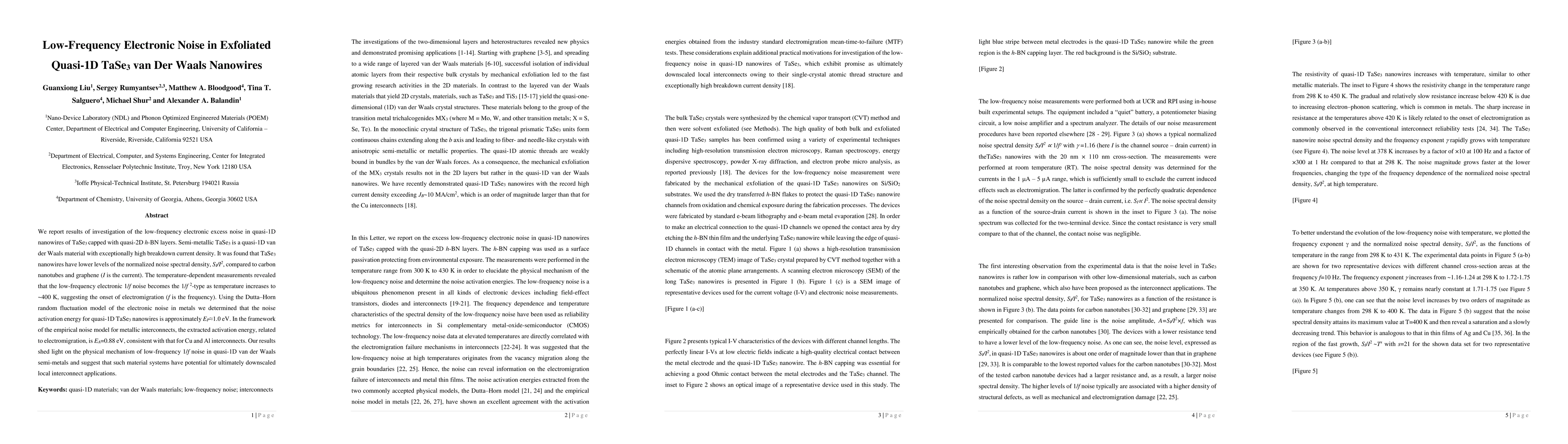 This study investigates the low-frequency electronic noise in TaSe3 quasi-1D van der Waals nanowires capped with h-BN, finding lower noise levels compared to carbon nanotubes and graphene. As temperature increases, the 1/f noise transitions to 1/f^2, indicating electromigration, with an activation energy of approximately 1.0 eV, suggesting potential for nanoscale interconnect applications.