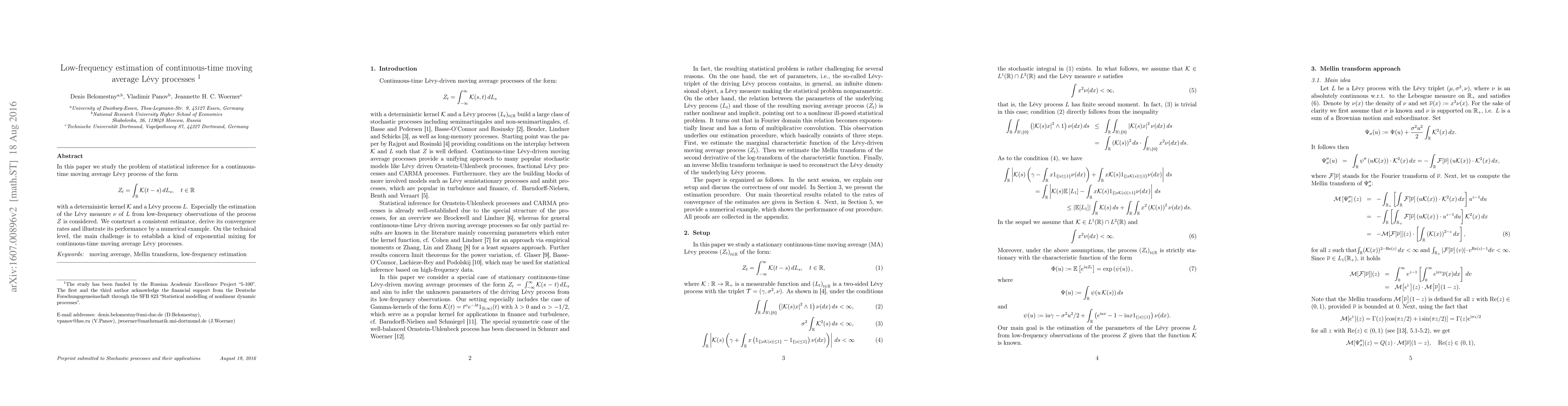 In this paper we study the problem of statistical inference for a continuous-time moving average L\'evy process of the form $$Z_{t} = \int_{\mathbb{R}}\mathcal{K}(t-s)\, dL_{s},\quad t\in\mathbb{R}$$ with a deterministic kernel (\K\) and a L{\'e}vy process (L\). Especially the estimation of the L\'evy measure (\nu\) of $L$ from low-frequency observations of the process $Z$ is considered. We construct a consistent estimator, derive its convergence rates and illustrate its performance by a numerical example. On the technical level, the main challenge is to establish a kind of exponential mixing for continuous-time moving average L\'evy processes.